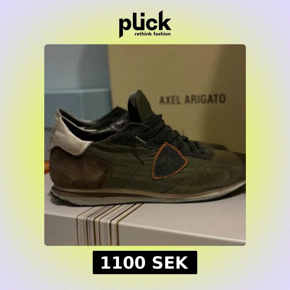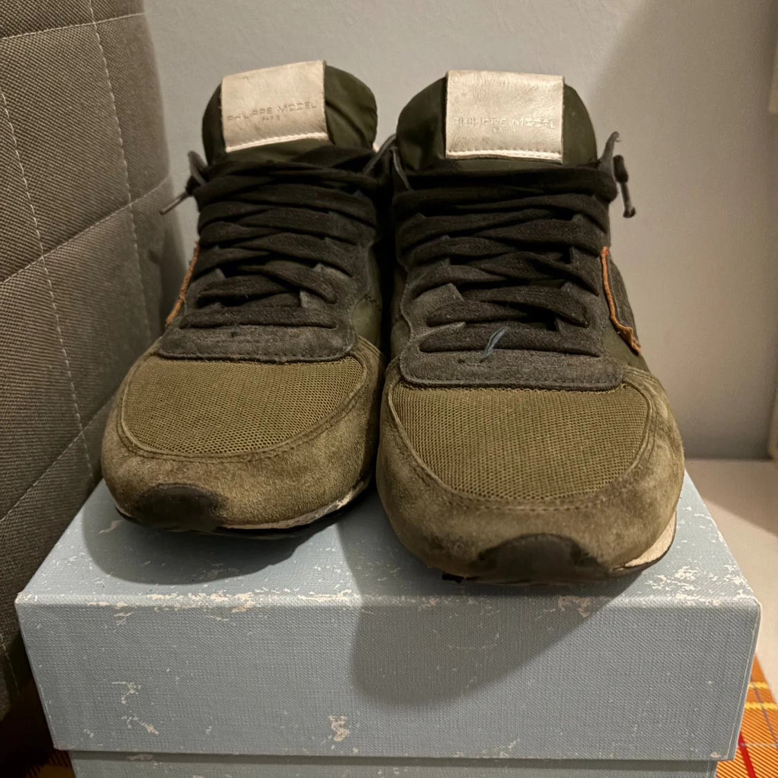 Snygga sneakers från Philippe Model i olivgrönt tyg och mocka med svarta detaljer och vit häl. Säljer för att de är för små! 100% riktiga men har tappat bort kvittot. Köpta i Malmö! Box kommer inte
