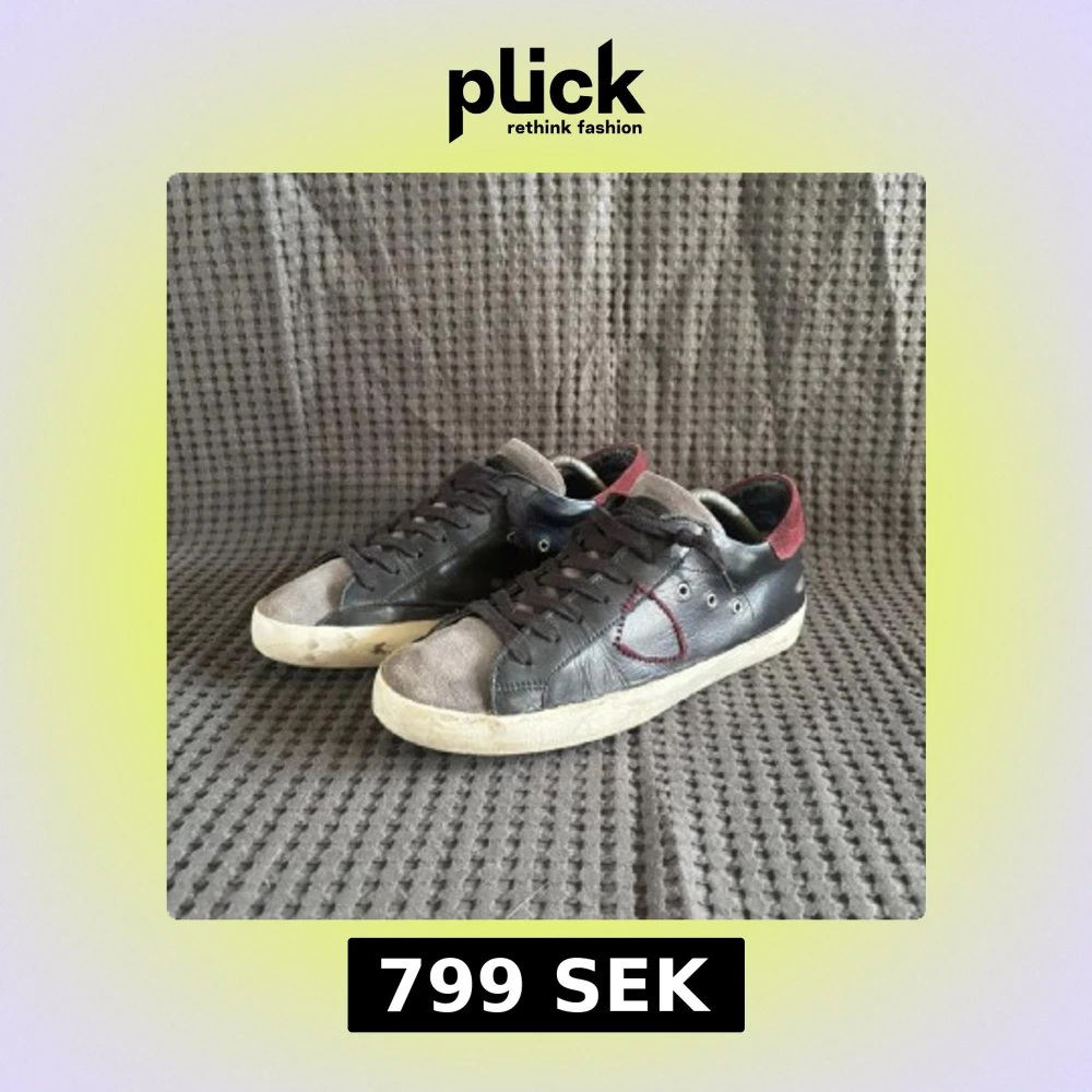Snygga svarta Philippe Model sneakers med grå mockadetaljer och vinröd häl. Skorna har snörning, rund tå och vit platt sula. Märkets logga syns på sulan och insidan. Materialmix av skinn och mocka ger en cool kontrast. Perfekt för dig som gillar streetstyle.