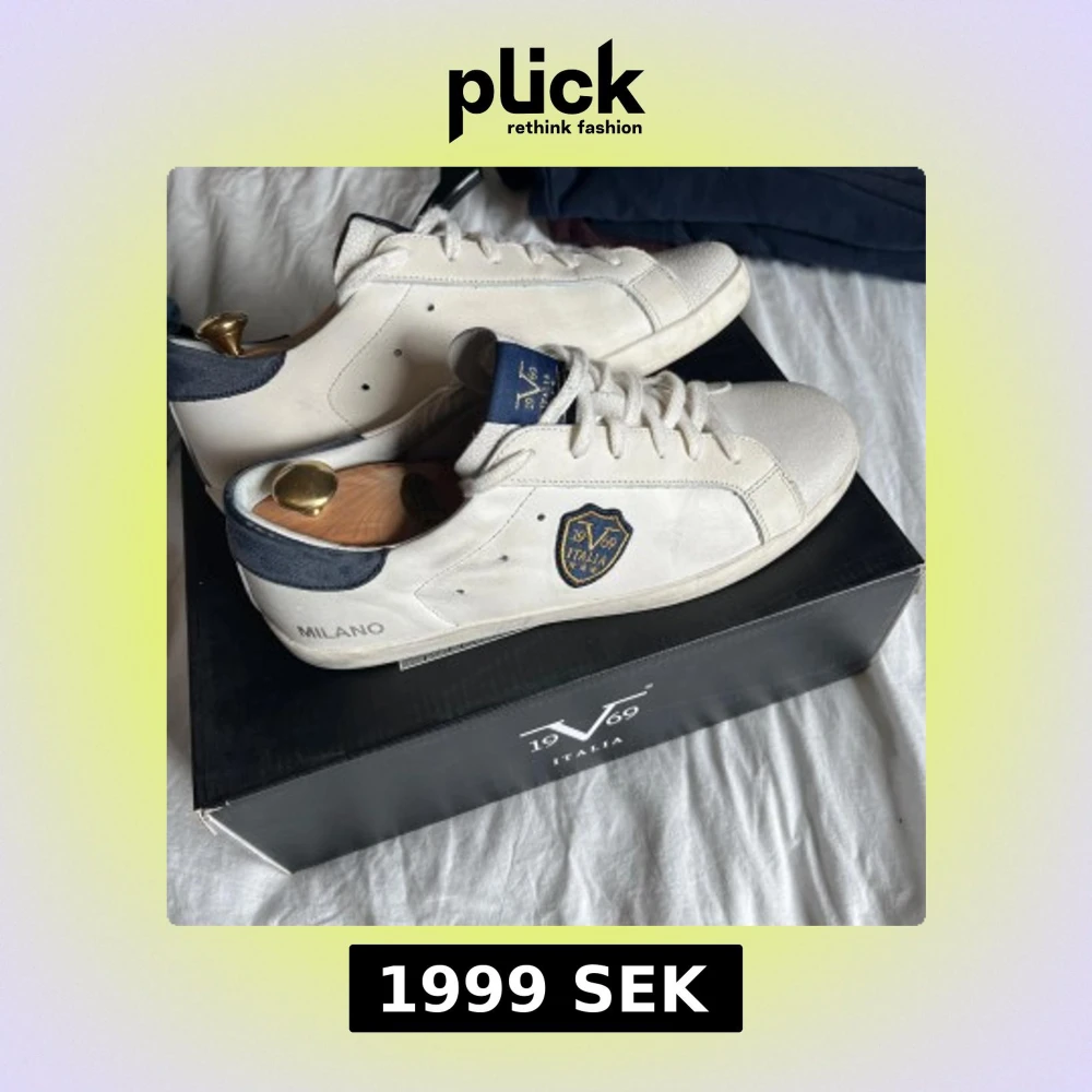 19V69 Italia Versace sneakers, använda 3 gånger men de är lite stora. Storlek 43. Skorna är i nyskick och nypriset ligger på 2500 och de är slutsålda överallt. röda orginalsnören medföljer i lådan.