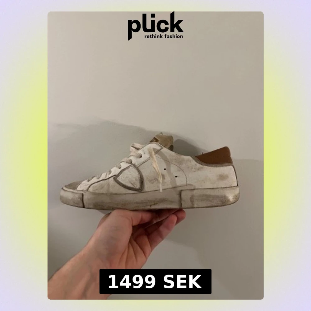 Säljer ett par vita Philippe Model sneakers med bruna detaljer vid hälen och på plösen. Skorna har snörning, rund tå och platt sula. Materialet är en mix av skinn och textil, med tydlig branding under sulan. Perfekt för dig som gillar stilrena och klassiska sneakers.