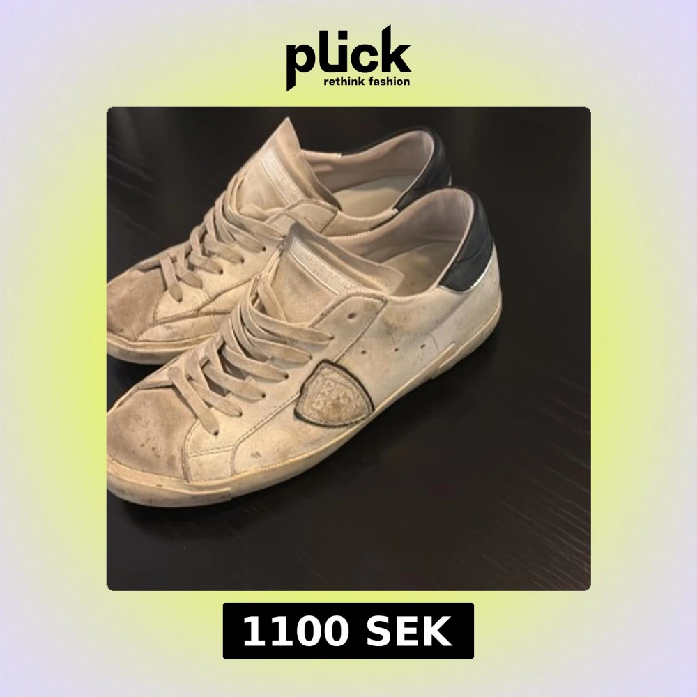 Säljer ett par vita Philippe Model sneakers i skinn med svart häl och klassisk logotyp på sidan. Skorna har rund tå, platt sula och snörning framtill. Stilren design med diskreta sömmar och detaljer, perfekt för dig som gillar exklusiva sneakers. Kan gå ner pris vid snabb affär