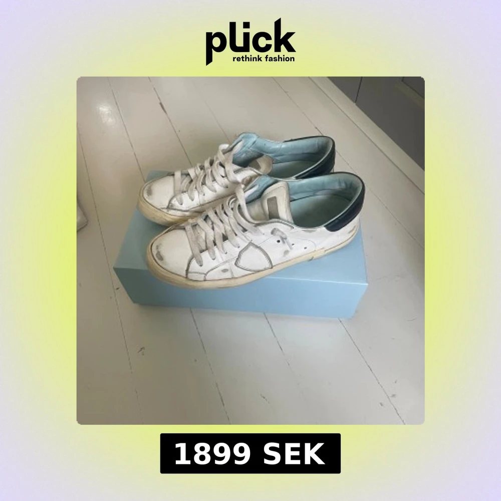Snygga vita sneakers från Philippe Model med svarta detaljer på hälen och ljusblå insida. Skorna har klassisk snörning, rund tå och platt sula. Tillverkade i skinn och passar perfekt till en avslappnad streetstyle-look. De är i bra skick förutom heelswipsen på ena skon det är storlek 41 men sitter som 42 hör av er vid minsta fundering