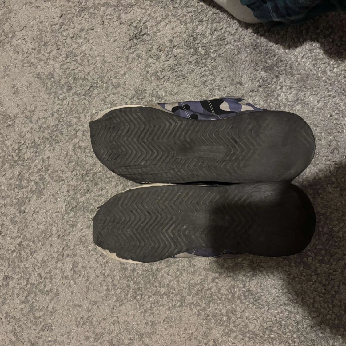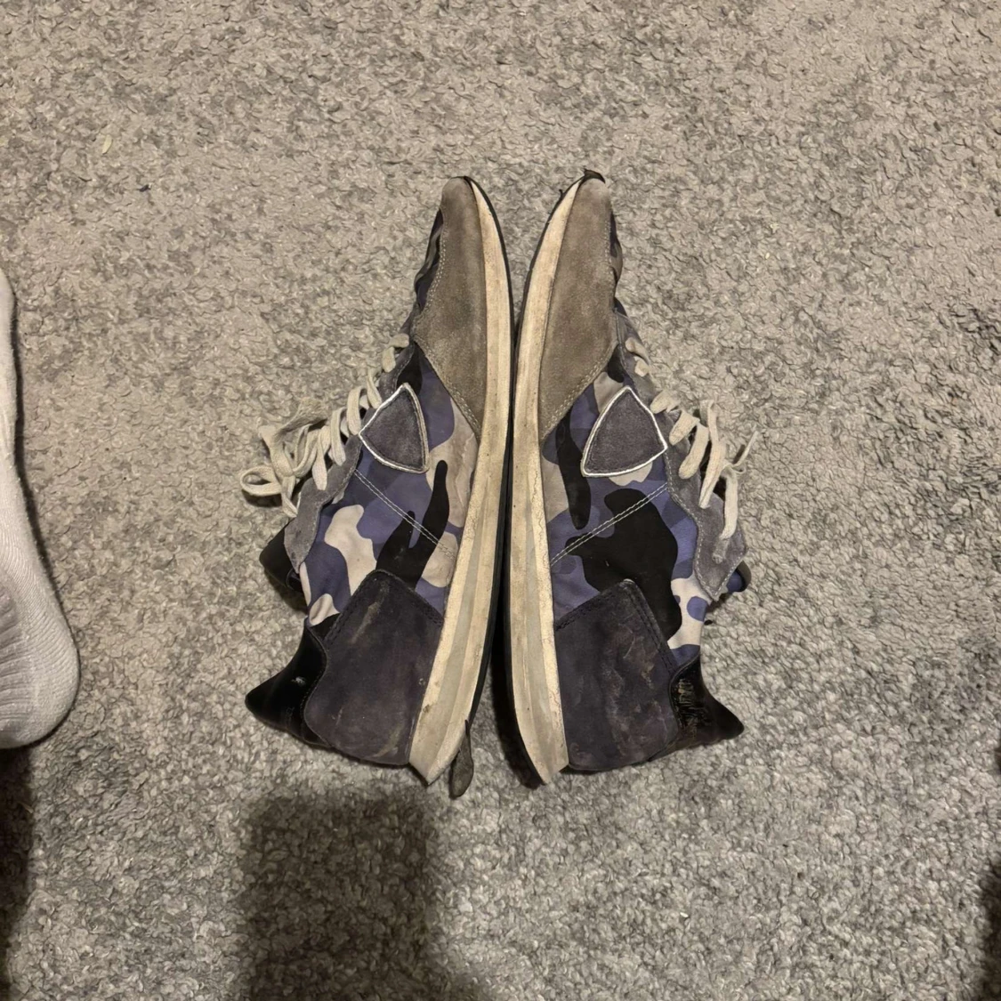 Snygga sneakers från Philippe model med blått, svart och grått camouflagemönster. Skorna har detaljer i mocka och skinn, vita snören och svart häl. Några skavanker men modellen säljs inte längre och funkar bra. Pris kan diskuteras vid snabb affär.