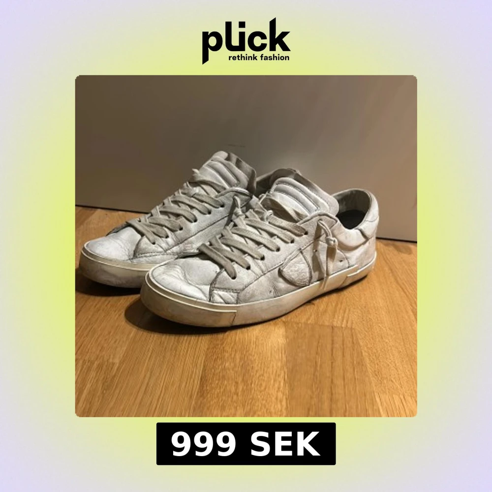 Snygga vita sneakers från märket Philippe model. Dessa skor är i skicket 5,5/10. Storlek 43. Inget Og följer med. De är slitna men inga defekter som påverkar dina fötter som att dom läcker t.ex. Där av det låga priset. Priset är inte hugget i sten och hör av er vid frågor! /SS_resell