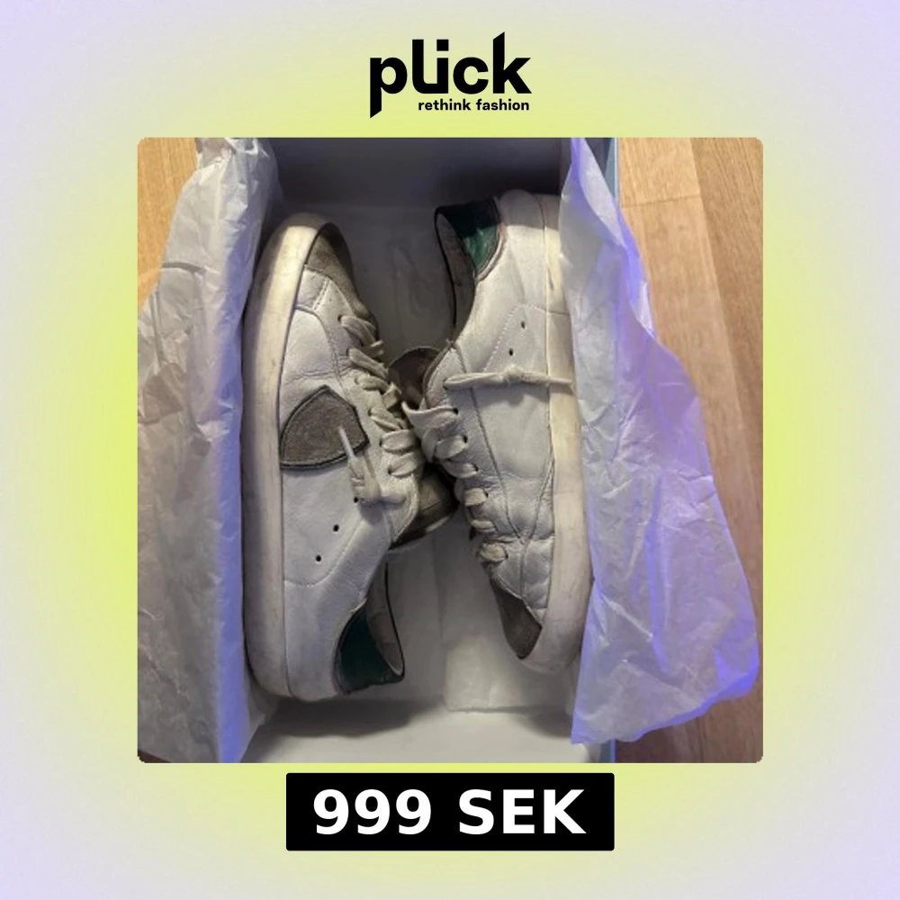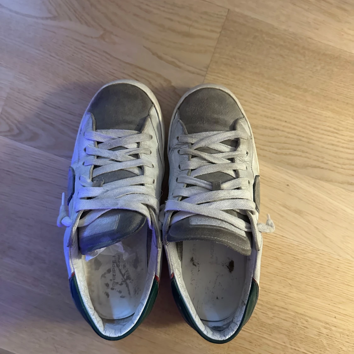 Säljer ett par vita Philippe Model sneakers med gråa och gröna detaljer. Skorna har snörning, rund tå och platt sula. Klassisk design med logotyp på sulan och bekväm passform. Perfekta för dig som gillar stilrena och sportiga skor. ÄR 36 MEN PASSAR 100% SOM 37-37,5. PRISET GÅR ATT DISKUTERA!