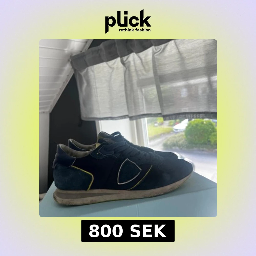 Blåa Phillipe Model trainers med neon gul/gröna detaljer.