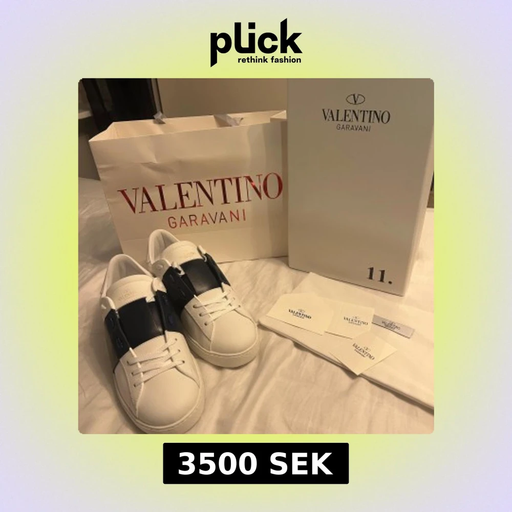 Snygga Valentino Opens i vitt skinn med bred marinblå läderdetalj över mitten. Klassisk rund tå, platt sula med mönstrad undersida och vita snören. Kommer med originalkartong, dustbag och tags. Perfekt för dig som gillar exklusiva sneakers med stil.