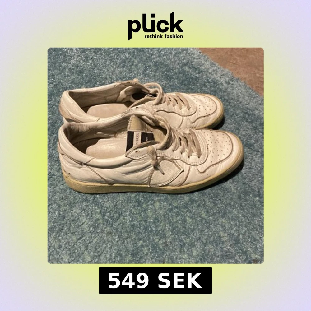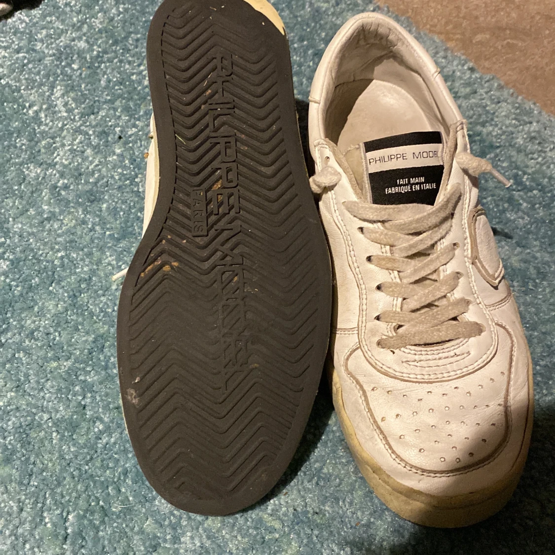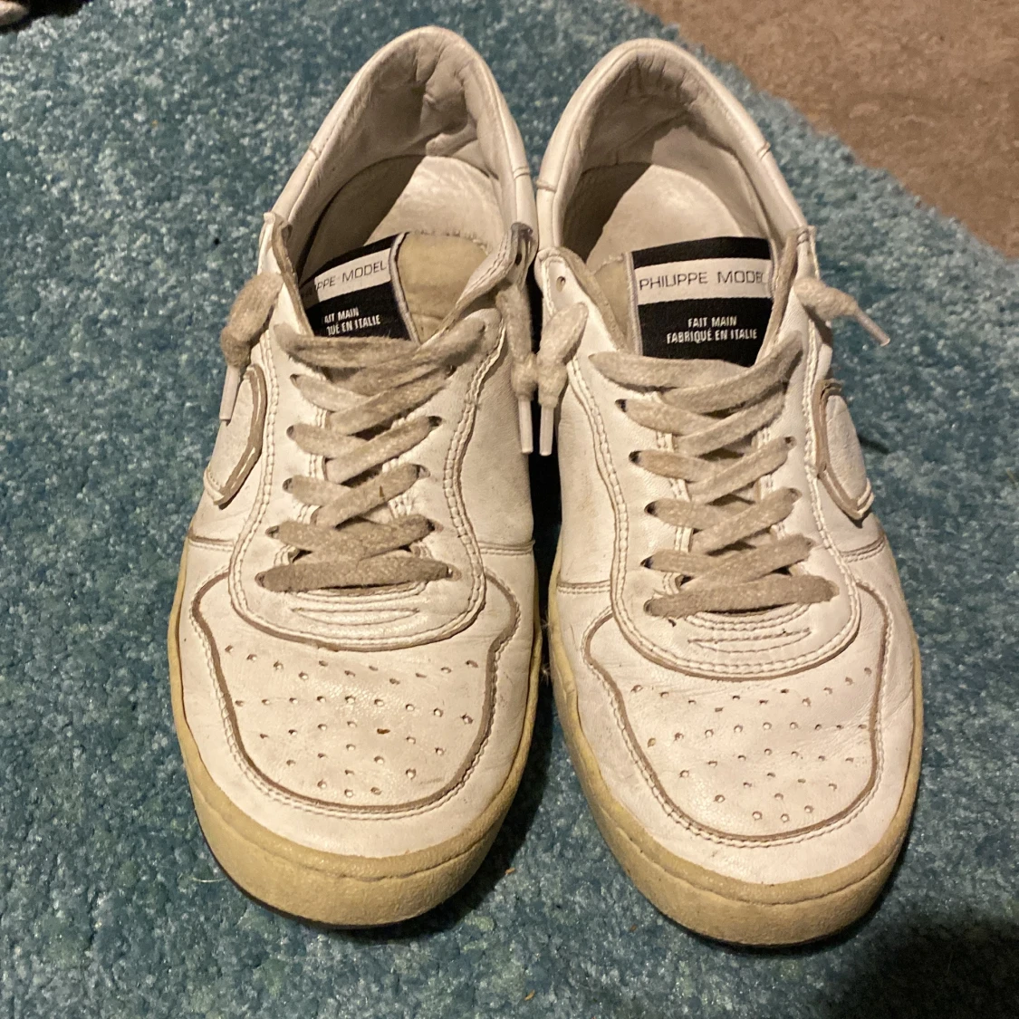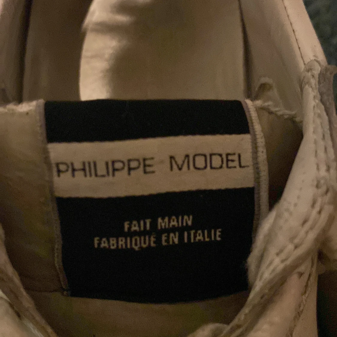 Snygga vita sneakers från Philippe Model, handgjorda i Italien. Skorna är i skinn med klassisk låg profil, rund tå och snörning. Yttersulan är beige och svart med tydlig logga undertill. Perfekta för dig som gillar stilrena och tidlösa sneakers.