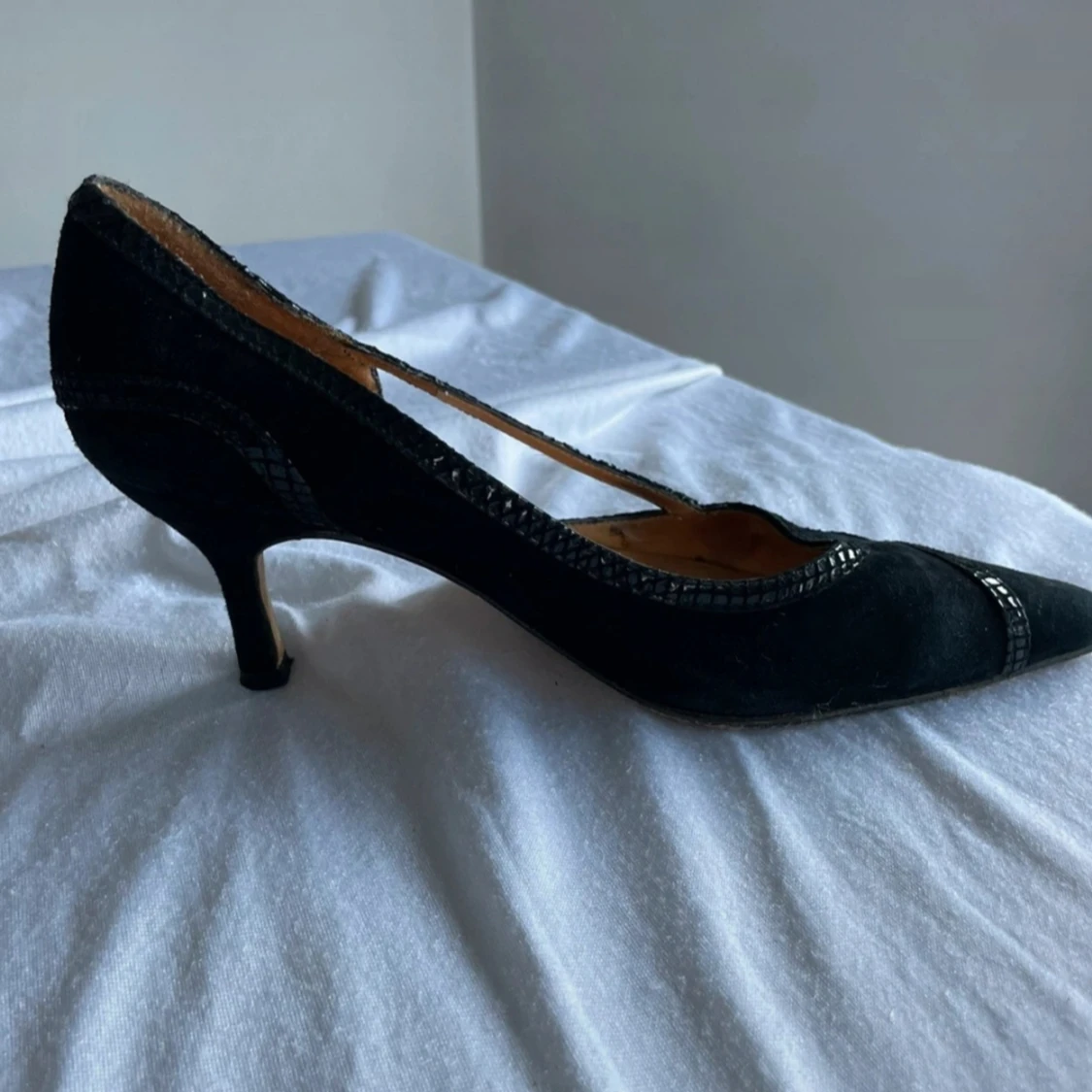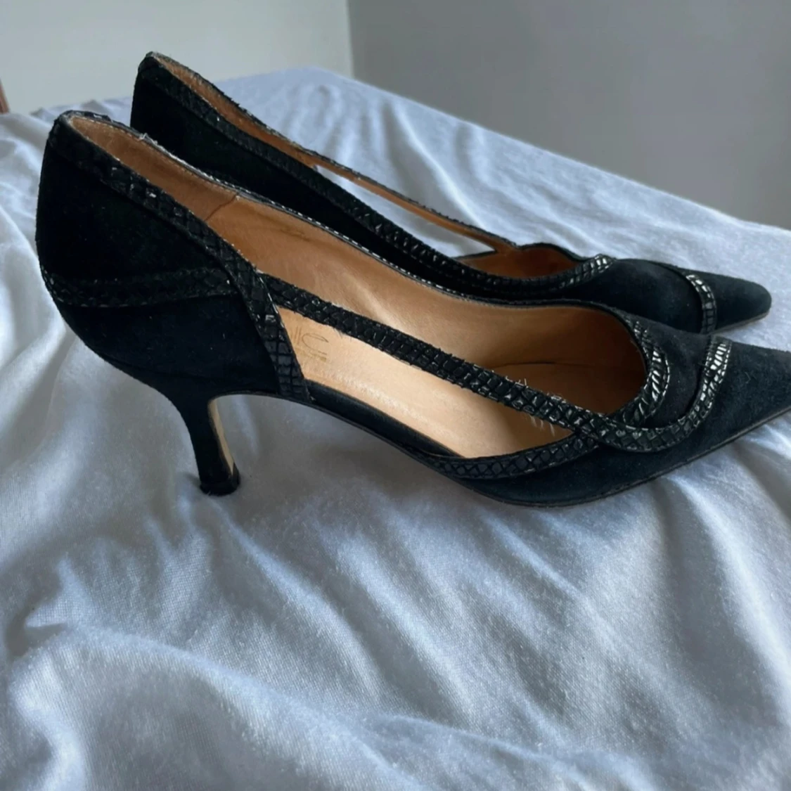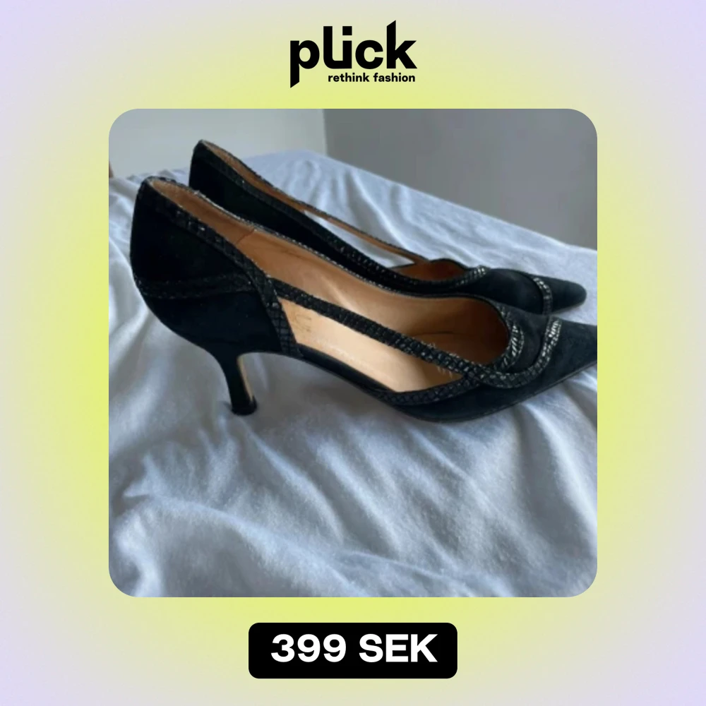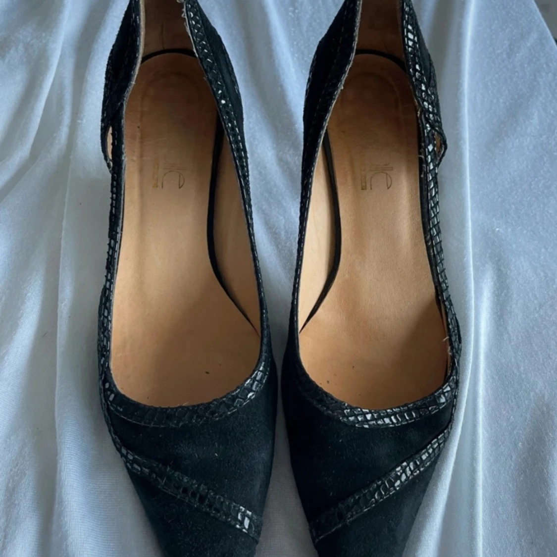 Svarta pums i mocka och läder. Stl 37,5 men det passar mig bättre och jag är 38.5. Aldrig använda utomhus. Läderkulan är i använt skick.