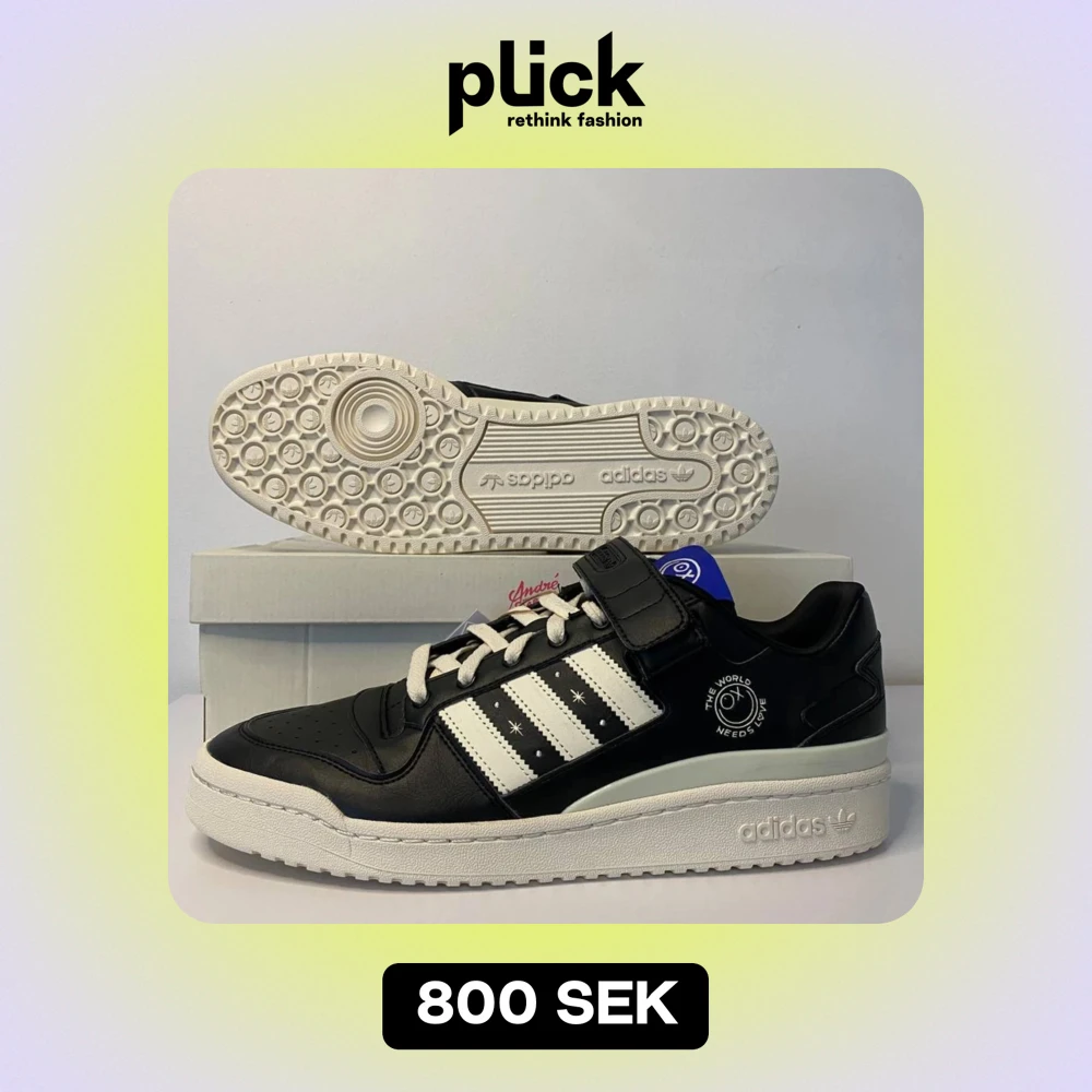 Snygga Adidas Forum Low sneakers i svart och vitt med coola detaljer. Skorna har snörning och kardborreband för extra stil och komfort. Perfekta för både vardag och fest. Helt nya och oanvända, redo att rocka din skosamling!