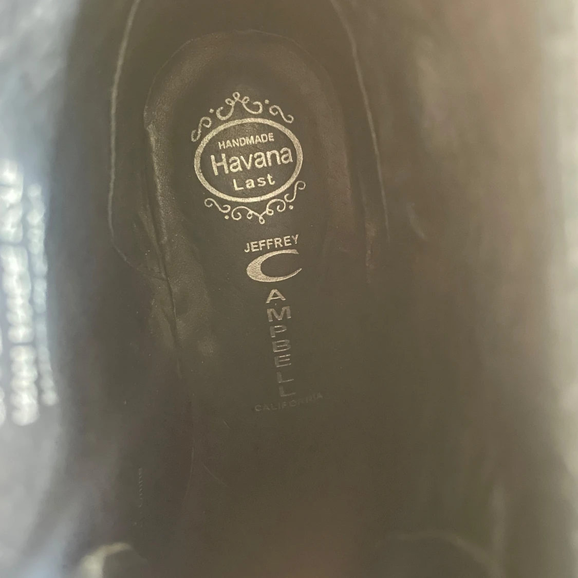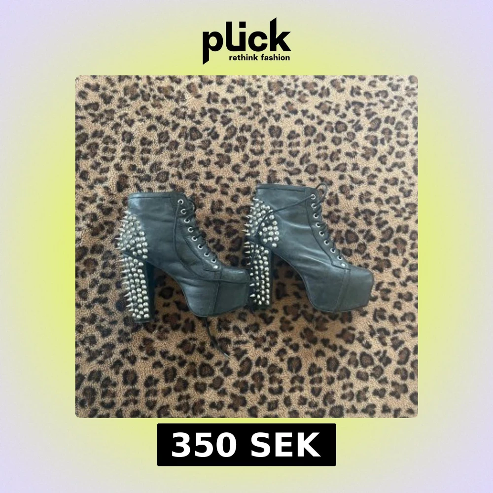 Säljer ett par svarta boots med hög platå och klack från Jeffrey Campbell. Skorna har snörning framtill och är dekorerade med silvriga nitar längs hälen och klacken. Perfekta för dig som vill sticka ut med din stil.