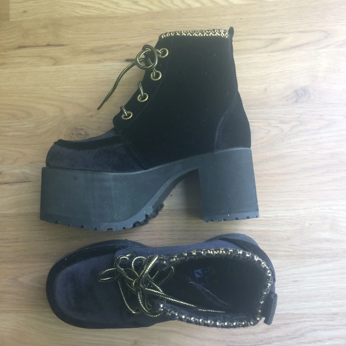 Kängor från T.U.K., svart sammet och snören i svart och guld. Helt oanvända, nypris runt 1000kr. Strl 37 men ganska små. Lätta för att vara platå. Finns i Uppsala men kan också mötas upp i Stockholm.