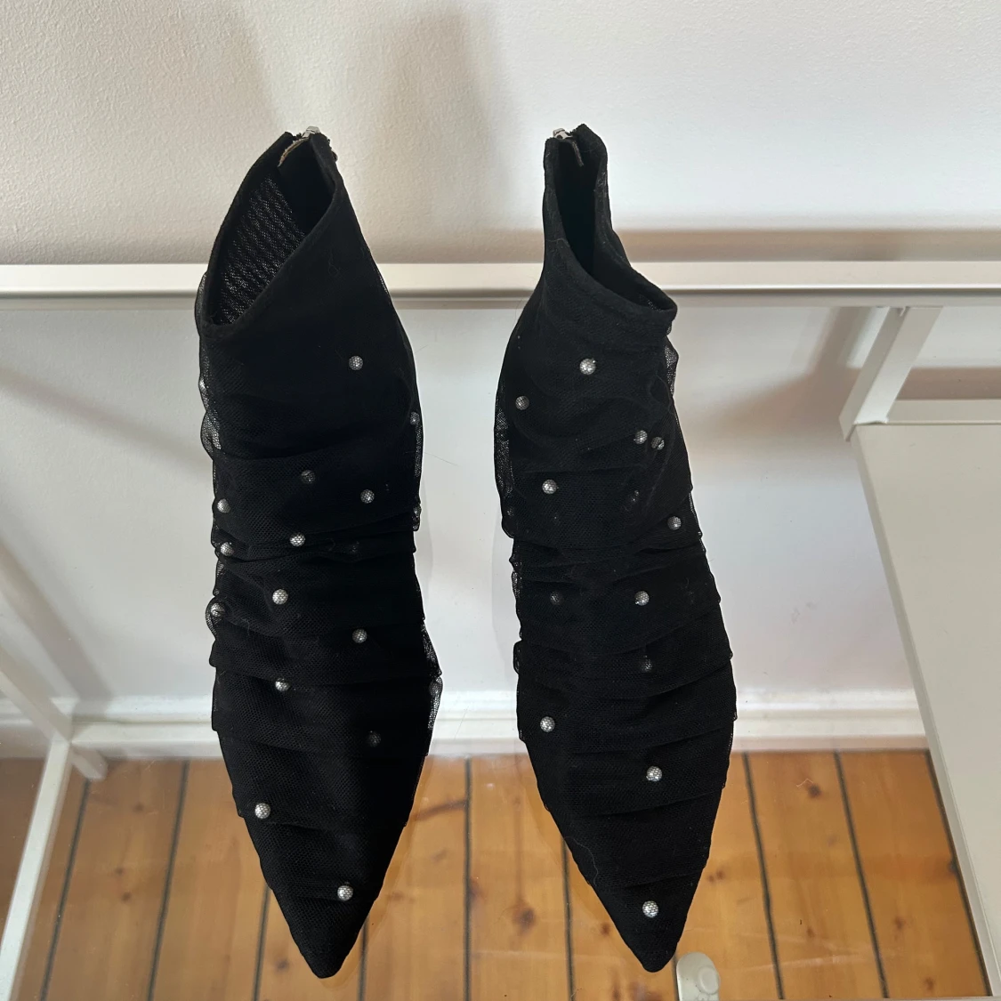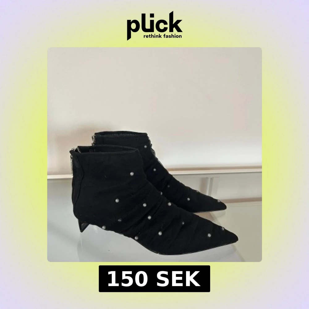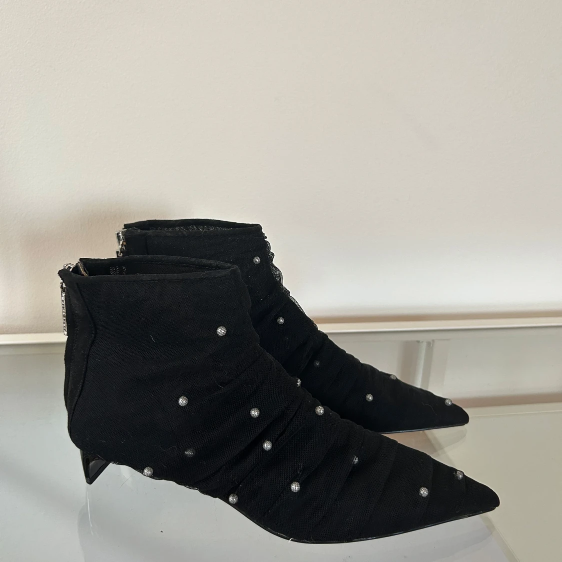 Snygga svarta boots från Zara med spetsig tå, låg klack och pärldetaljer över hela skon. Skorna har dragkedja bak och är täckta med ett tunt tyg i lager. Perfekta för dig som vill sticka ut med en cool och elegant look.