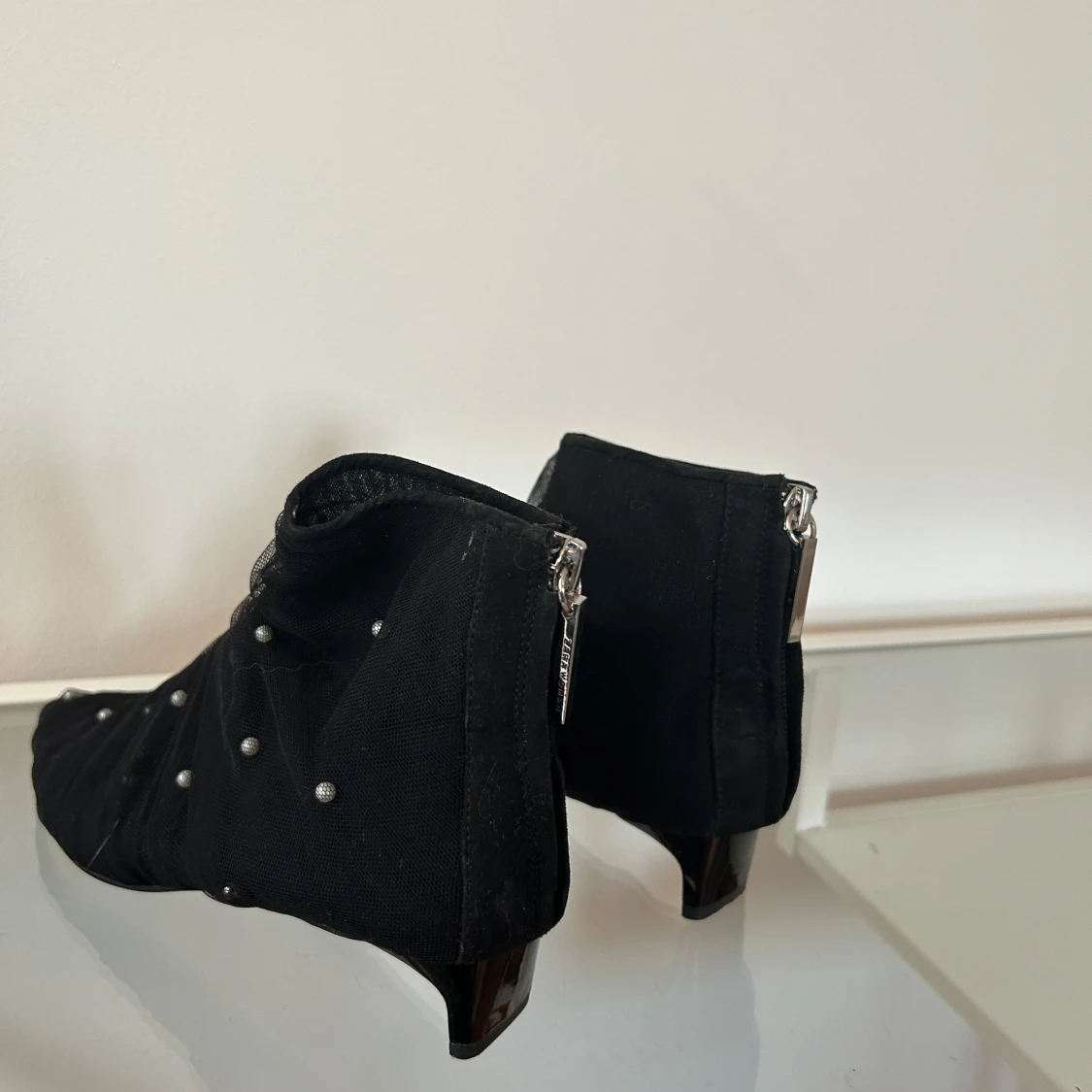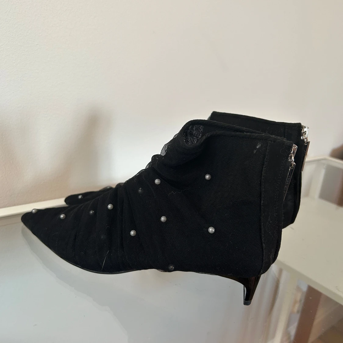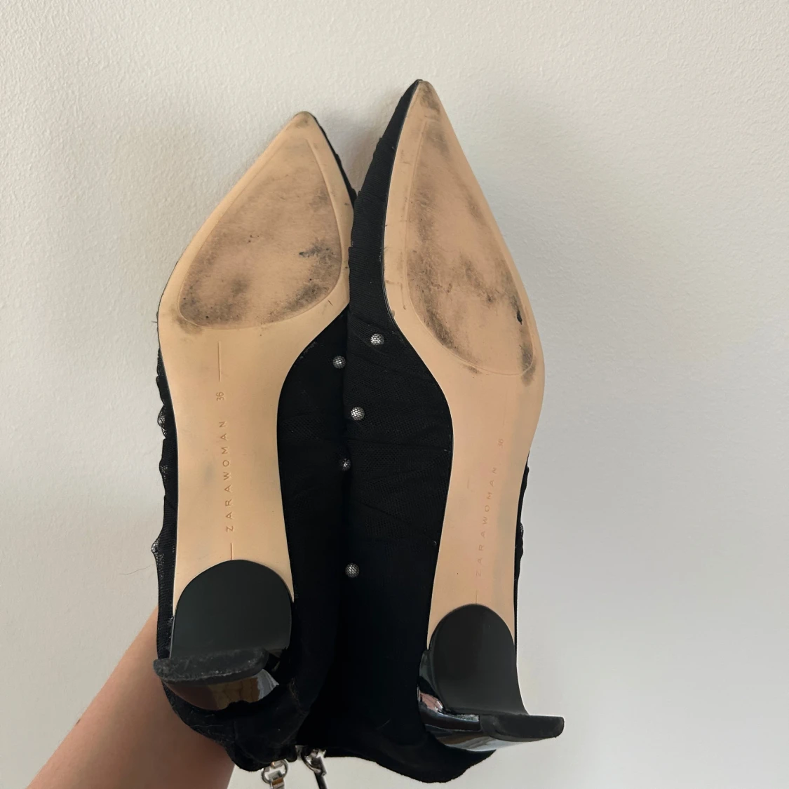 Snygga svarta boots från Zara med spetsig tå, låg klack och pärldetaljer över hela skon. Skorna har dragkedja bak och är täckta med ett tunt tyg i lager. Perfekta för dig som vill sticka ut med en cool och elegant look.
