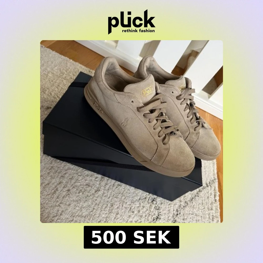 Stilrena sneakers i beige mocka från Polo Ralph Lauren med klassisk låg profil och rund tå. Skorna har snörning, diskret logga på sidan och guldiga Polo-detaljer på plös och sula. Perfekta för en clean och avslappnad look.