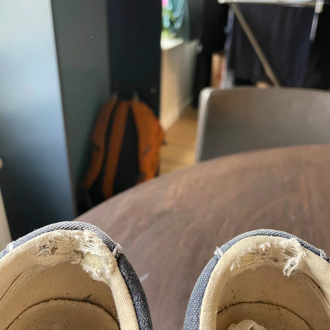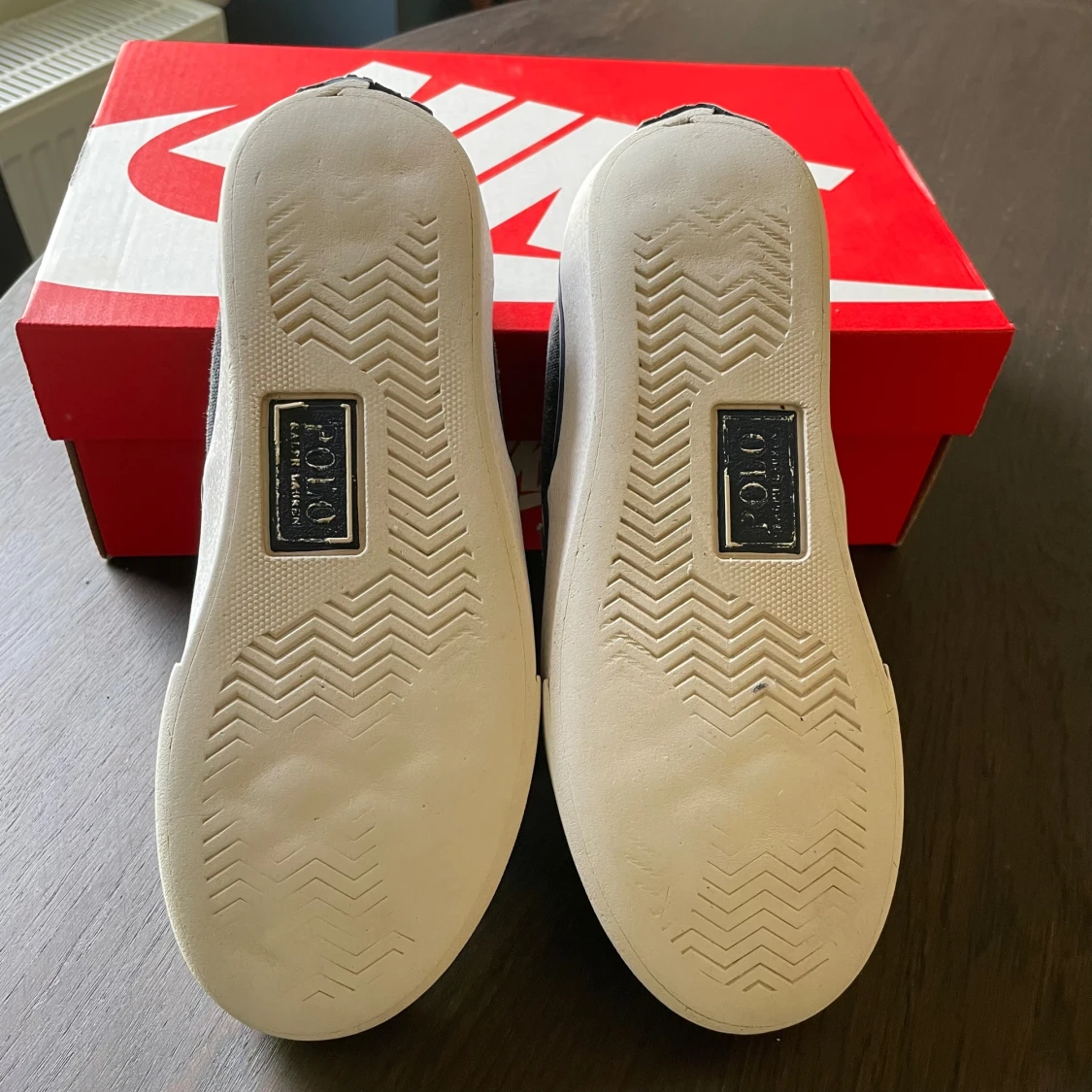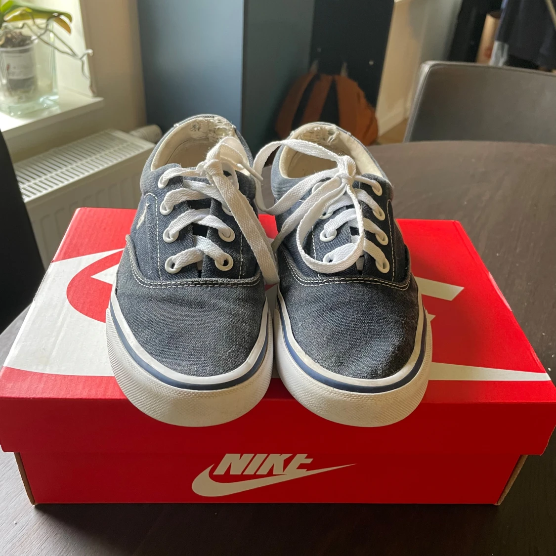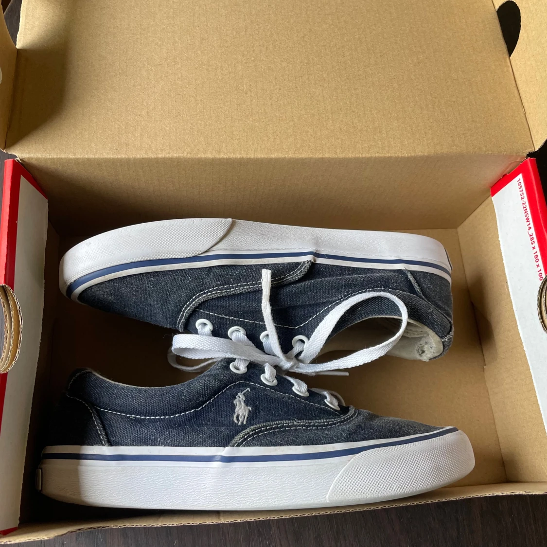 Poli rl sneakers – begagnade Säljer ett par Polo rl sneakers i mörk denimfärg med vit sula. Skorna är använda men i ganska bra skick. Sulorna är fortfarande hela och har bra grepp, men det finnsslitage på bakkanten med två synliga hål i fodret vid hälen. Trots slitaget är skorna fortfarande bekväma och fullt användbara. Perfekt som vardagsskor eller som ett extra par. Tveka inte att höra av dig om du vill ha fler bilder eller frågor?