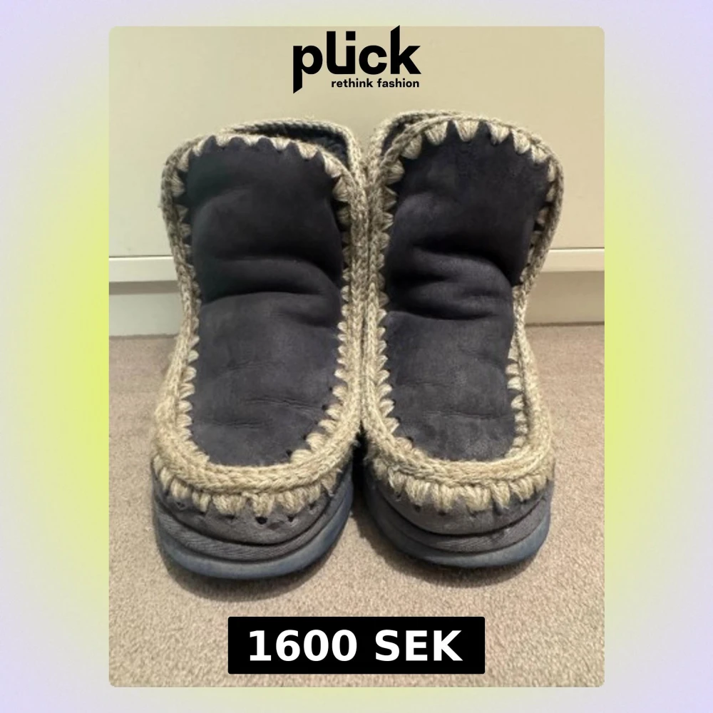 Säljer ett par boots från Mou i mörkgrå mocka med grov beige stickad kant runt hela skon. De har en platt sula i gummi och rund tå. Perfekta för kalla dagar med sin höga och mjuka design. Märket syns tydligt baktill och under sulan.