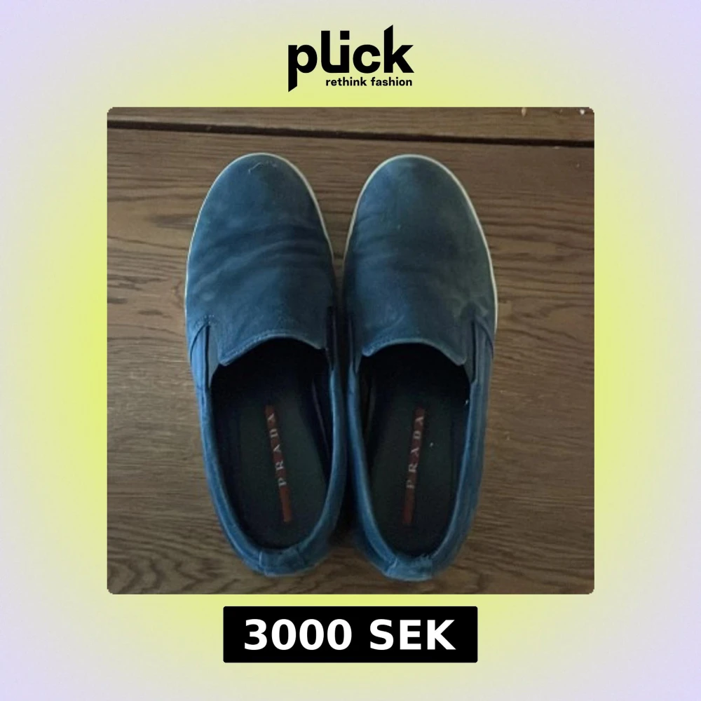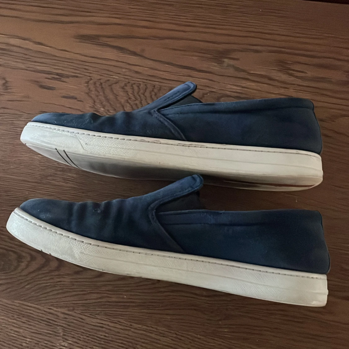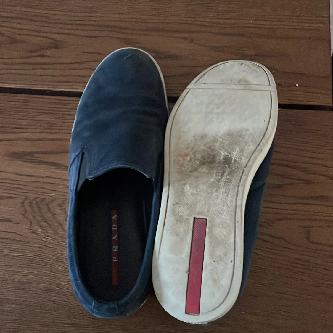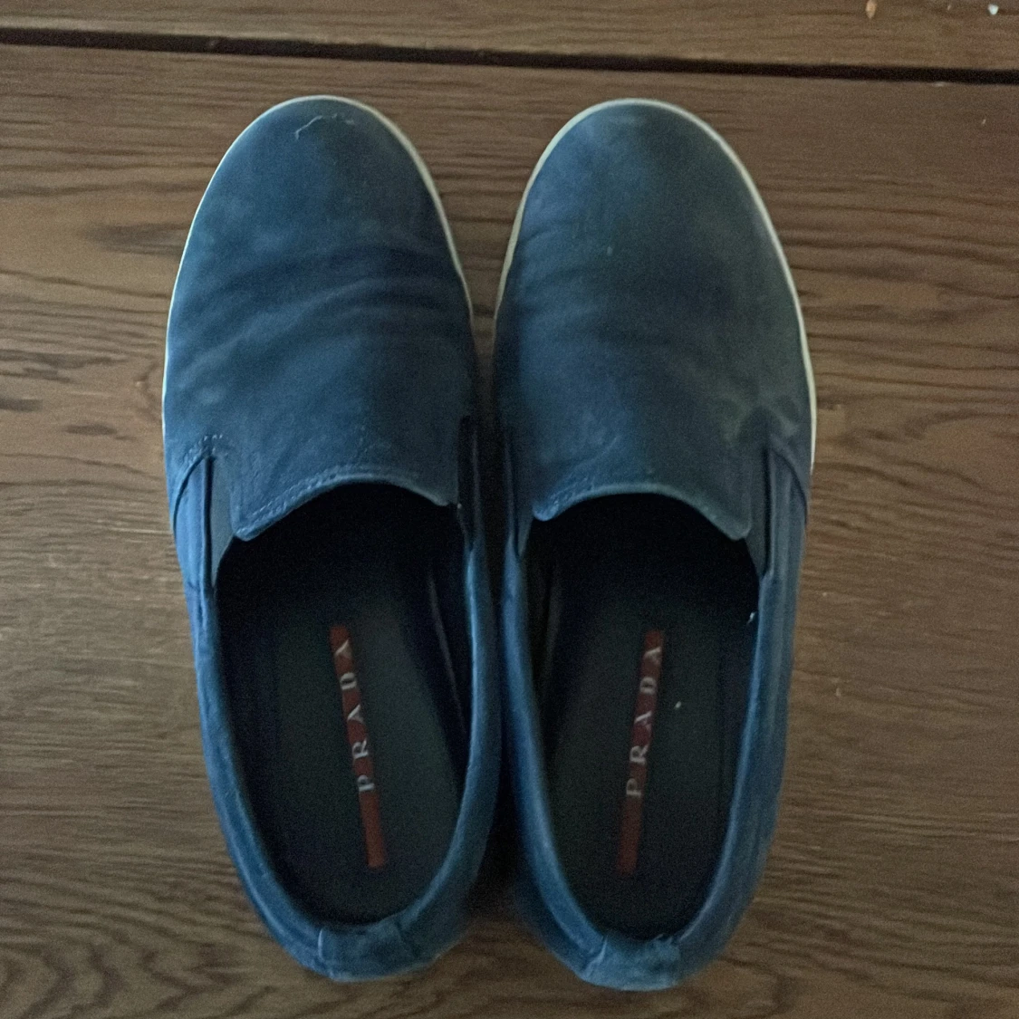 Snygga blå loafers från Prada med vit sula. Skorna har en stilren design utan snörning, vilket gör dem enkla att ta på och av. Perfekta för en avslappnad men ändå elegant look.