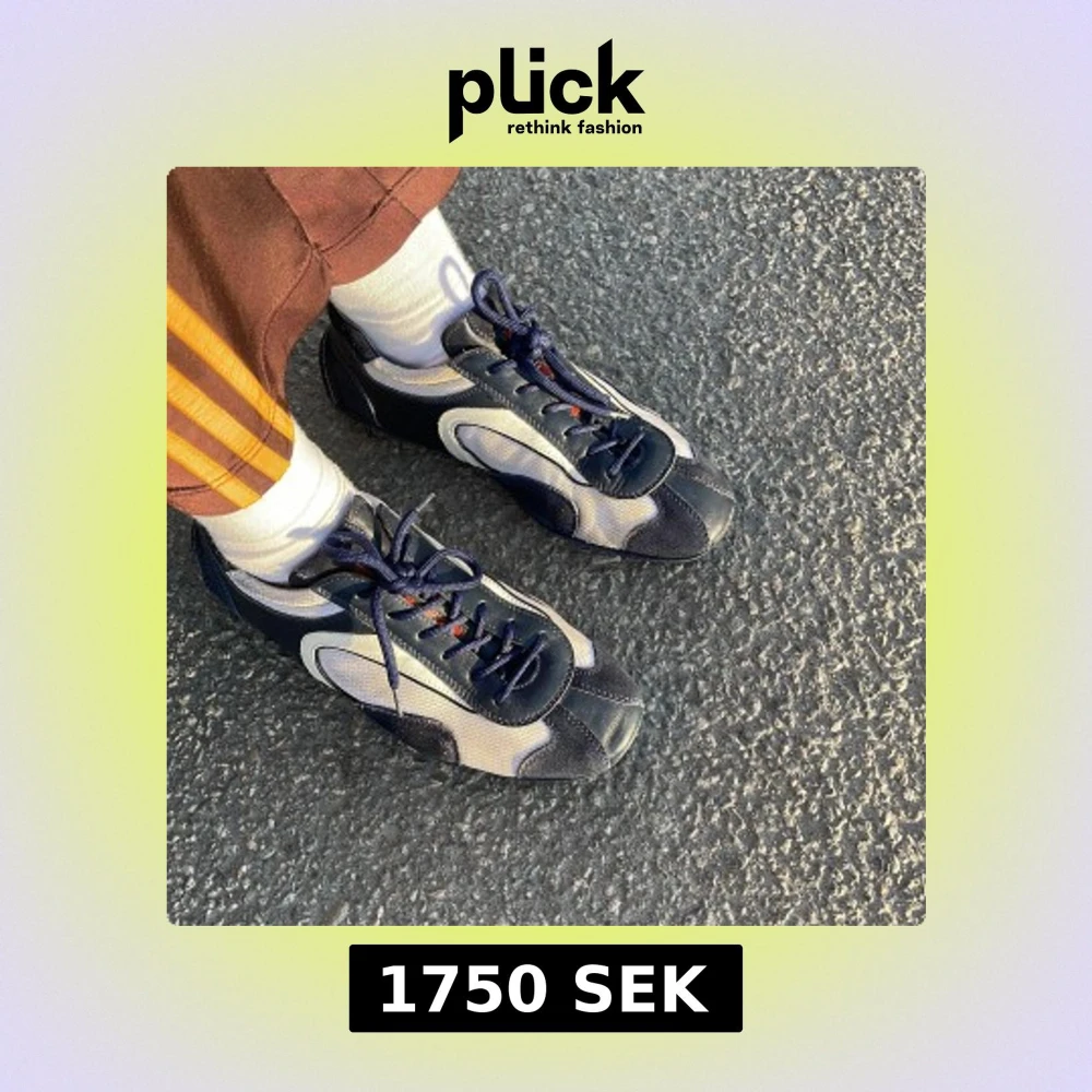 Snygga ’rare find’ vintage Prada sneakers i marinblått och vitt. Köpte dem online men dom var tyvärr förstora för mig. Bra kvalitet men med lite lätta fläckar och färgningar. Önskar jag kunde behålla dem. Både snygga och bekväma att gå i.