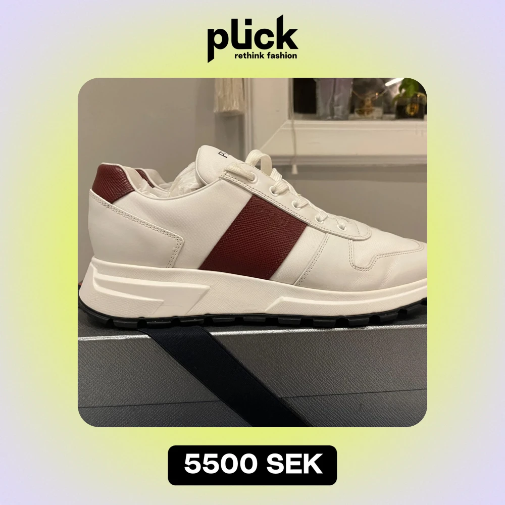 Säljer ett par snygga vita sneakers från Prada med en stilren design och röd detalj på sidan. Skorna har snörning och en bekväm sula, perfekt för både vardag och fest. De är i mycket bra skick och redo att användas direkt. Passar perfekt till både jeans och mer uppklädda outfits!