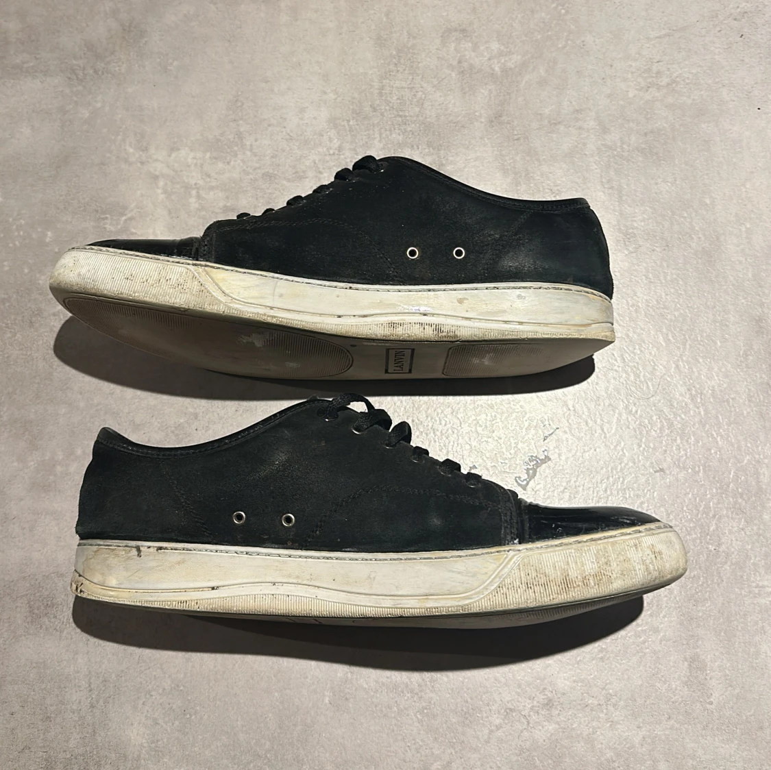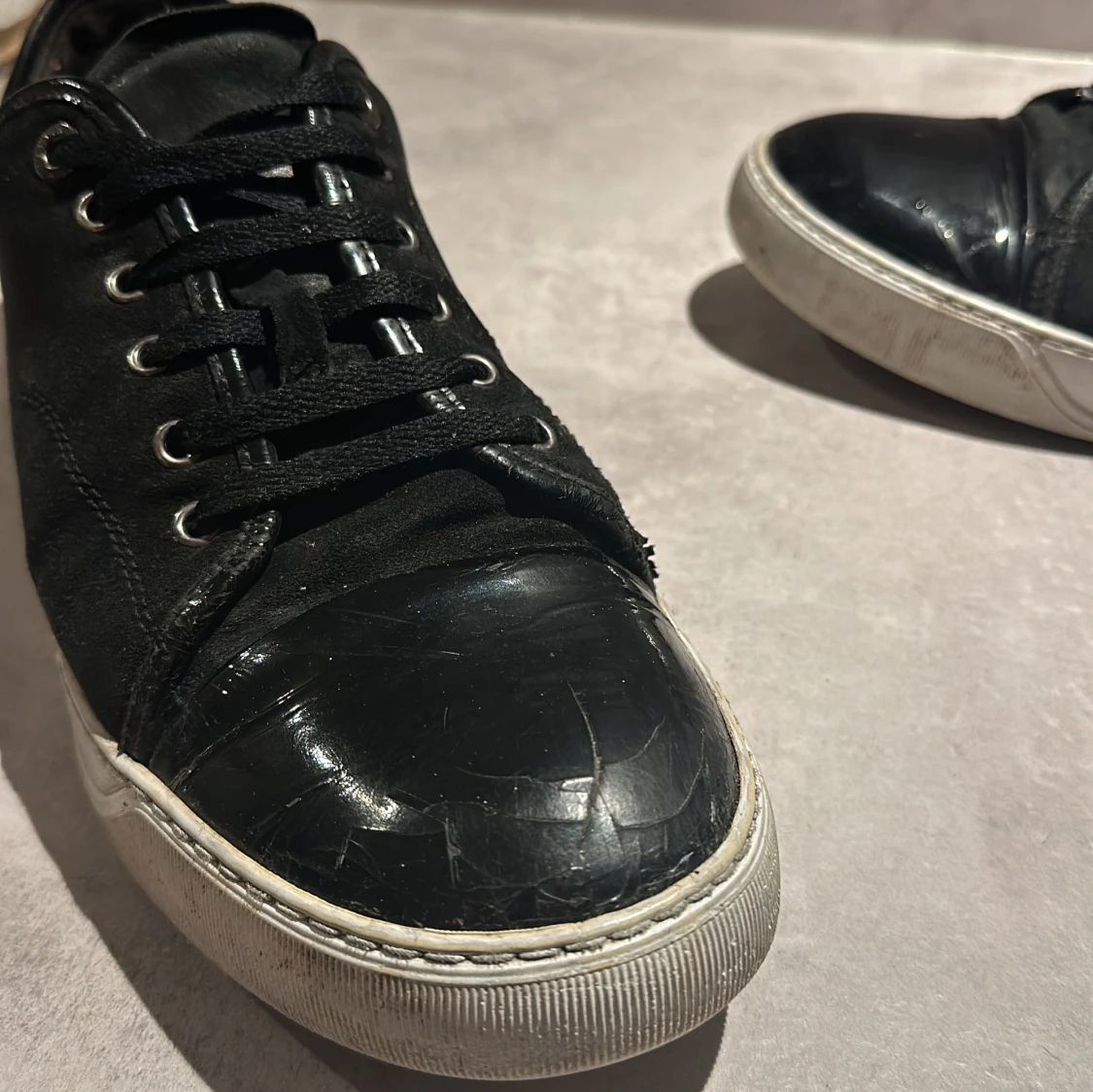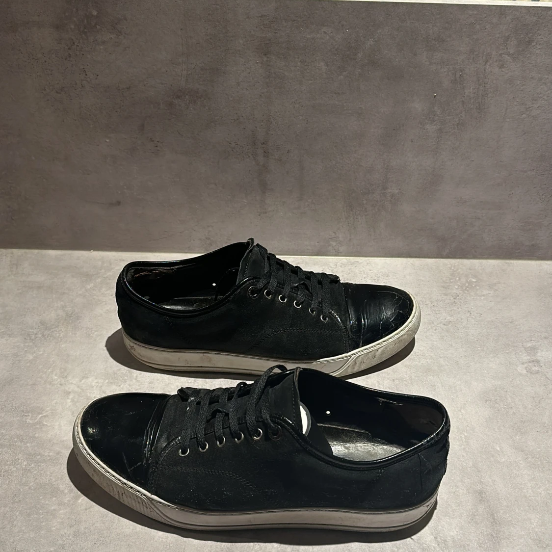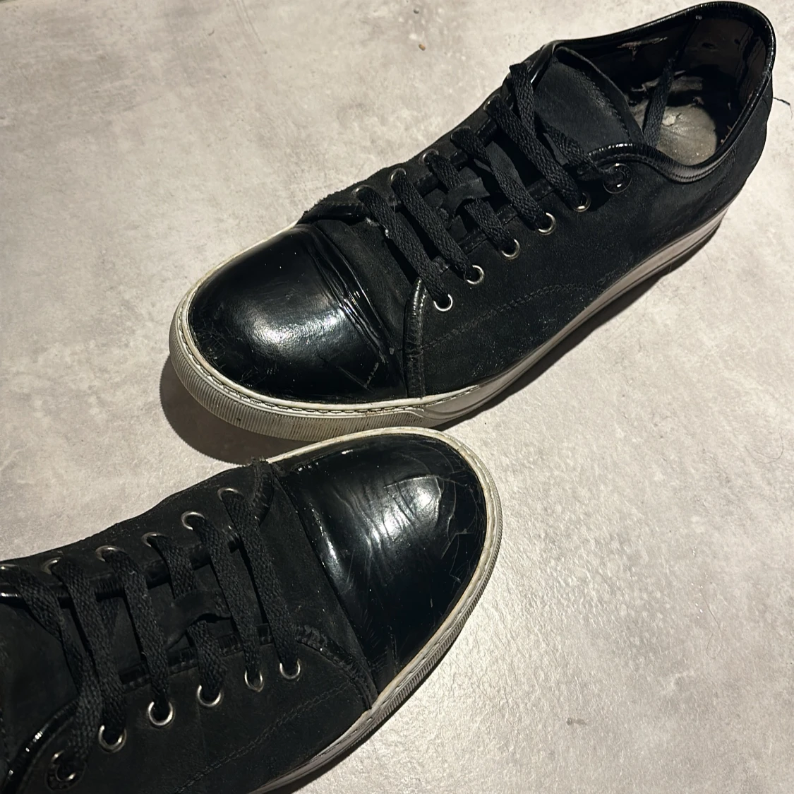 Säljer dessa riktigt schyssta Lanvins i storlek 44 men passar även 45. Dem är svarta och i skicka 7/10. Toe boxen på höger skon är lite sprucken och hälen lite sliten. Hör av er vid minsta lilla😃