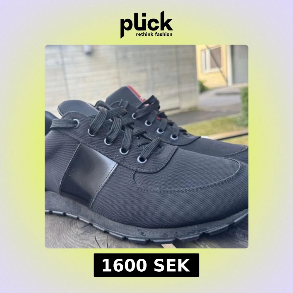 Snygga svarta sneakers från Prada med klassisk design och diskret röd logga på plösen. Skorna har snörning, rund tå och är tillverkade i slitstark textil med detaljer i skinn. Perfekta för dig som vill ha en stilren och exklusiv look.