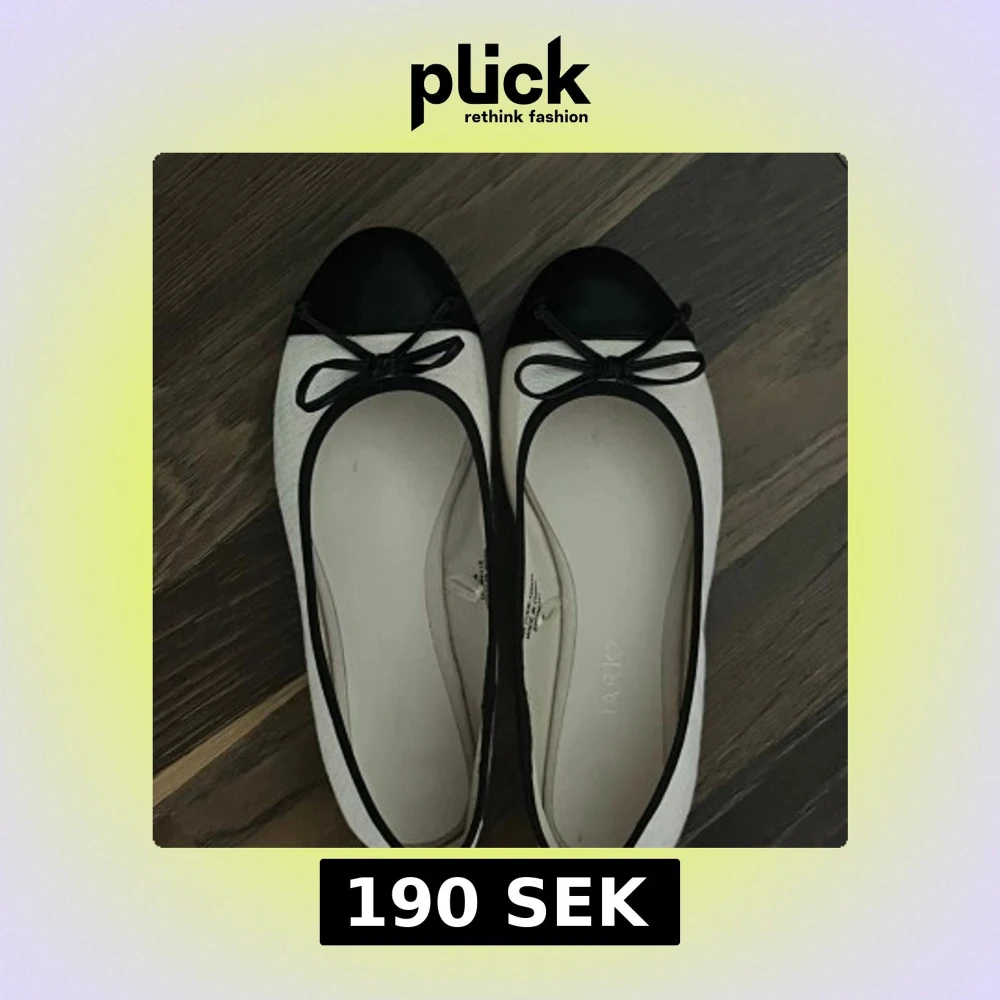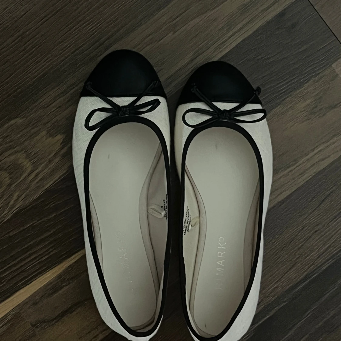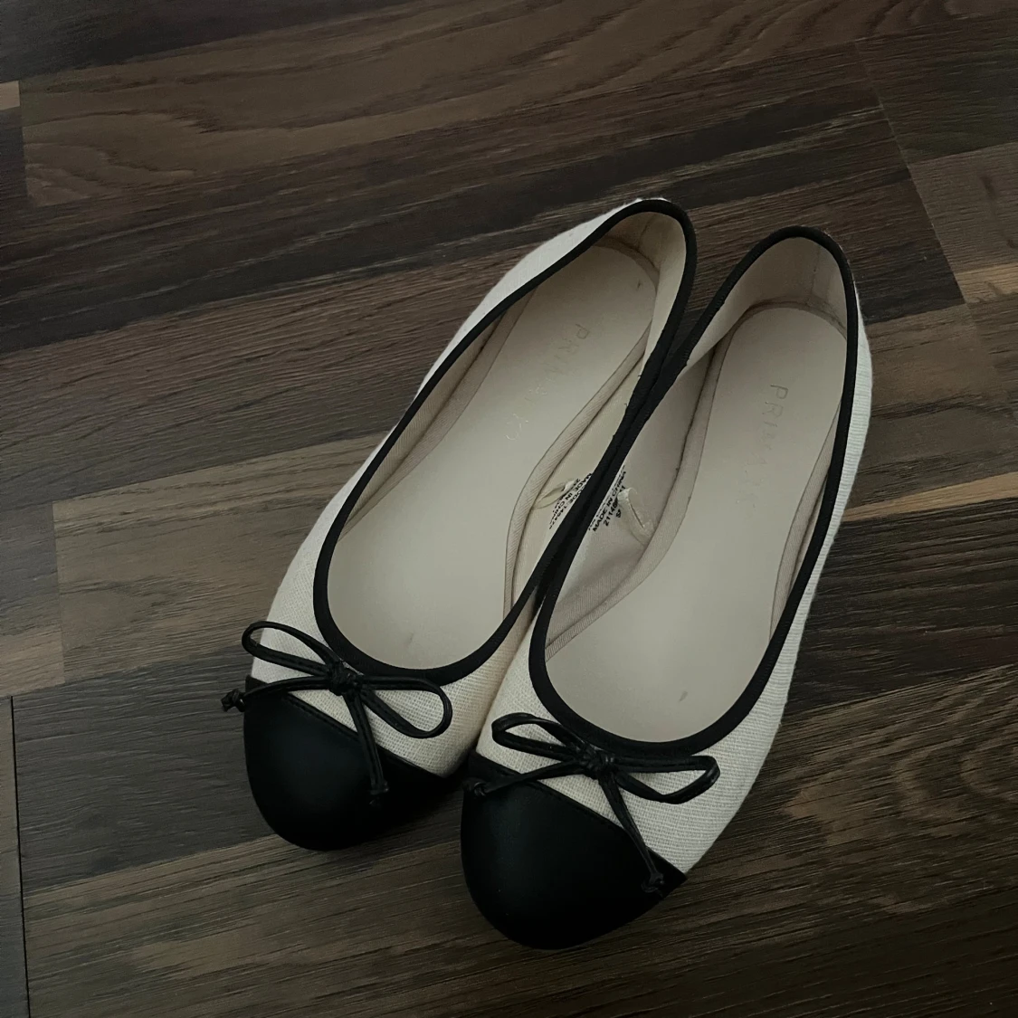 Snygga ballerinaskor från Primark i svart och vitt med rund tå och dekorativ rosett framtill. Skorna har svart tåparti och kant, vilket ger en klassisk look. Perfekta att matcha med både jeans och kjol för en stilren vibe.