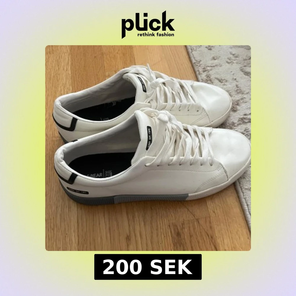 Säljer ett par stilrena vita sneakers från Pull&Bear med svarta detaljer och snörning. Skorna har rund tå och platt sula, perfekta för en clean och modern look. De är helt nya och används ett par gånger, de har kostat 450kr jag säljer de för 200 ( vid snabb köp kan priset diskuteras)