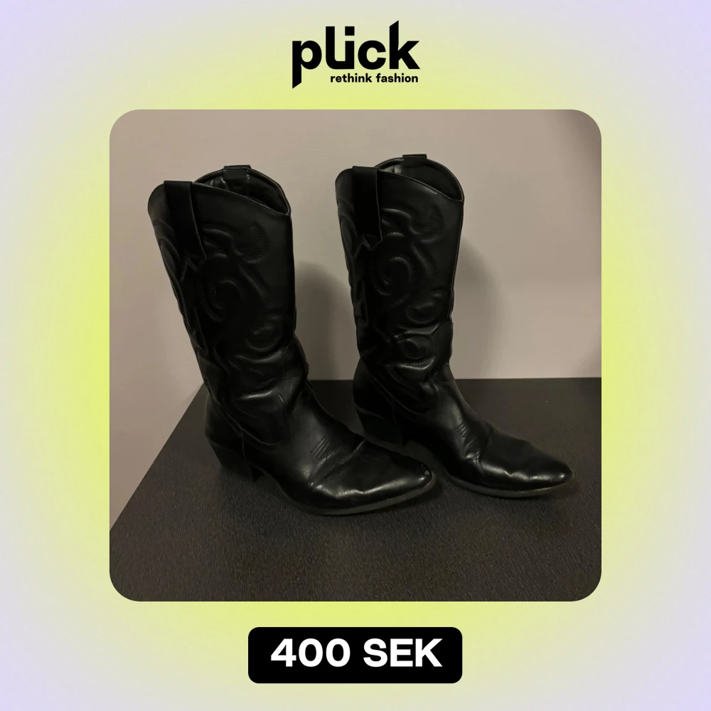Snygga svarta cowboy boots i skinn med dekorativa mönster. De har en spetsig tå och en liten klack som ger en cool look. Perfekta för både vardag och fest. Skorna är i bra skick och redo för nya äventyr! Bootsen är små storleken, vanligtvis har jag 38 i storlek men dessa i 39
