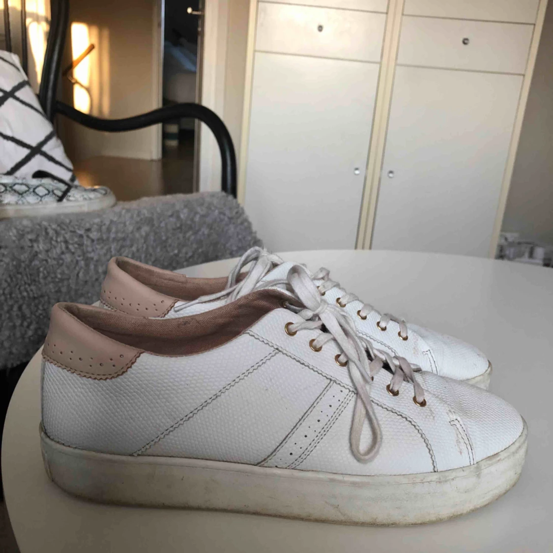 Klassiska vita sneakers köpta för 2 år sedan. Har tyvärr inte kommit till användning så mycket då dem varit för stora för mig. Bra skick men med en tvätt skulle de se som nya ut!