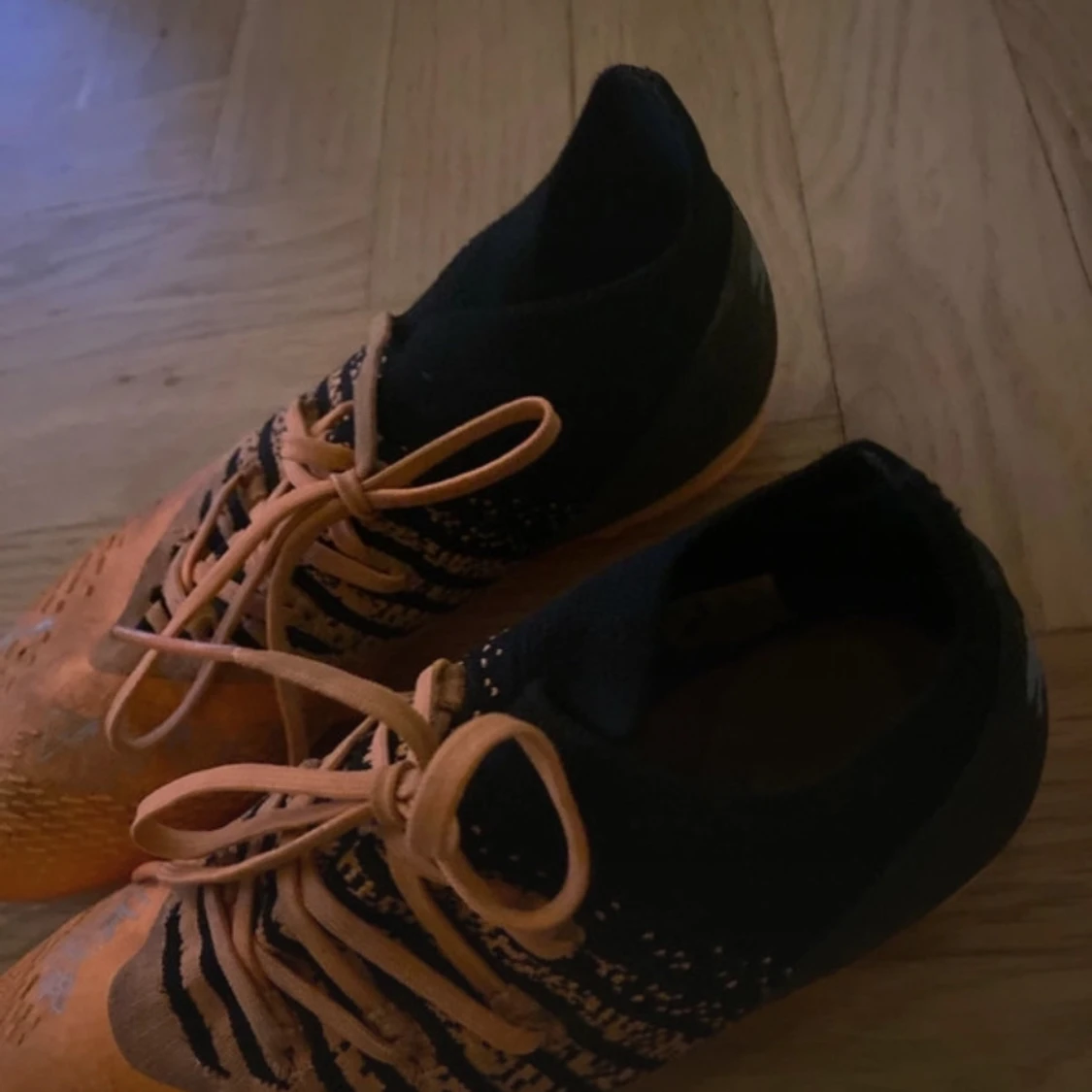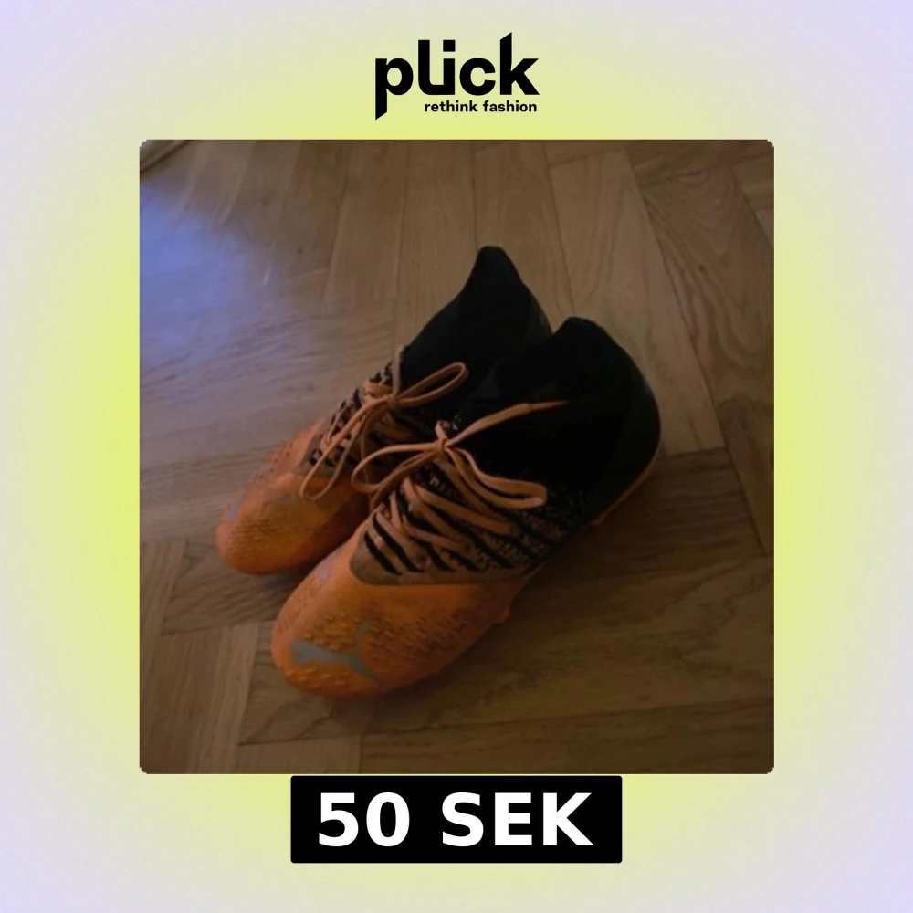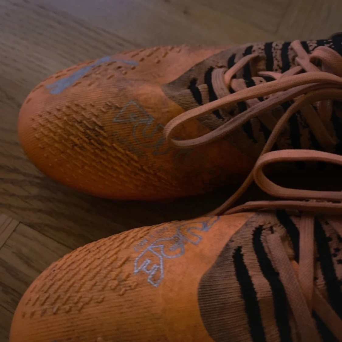 Snygga fotbollsskor från Puma i orange och svart med coola mönster och snörning. Ovandelen har textur för bättre bollkontroll och skon har en strumpliknande passform runt ankeln. de är lite smutsiga på ovansidan, men de tvättas självklart innan jag postar. Perfekta för dig som vill sticka ut på planen.