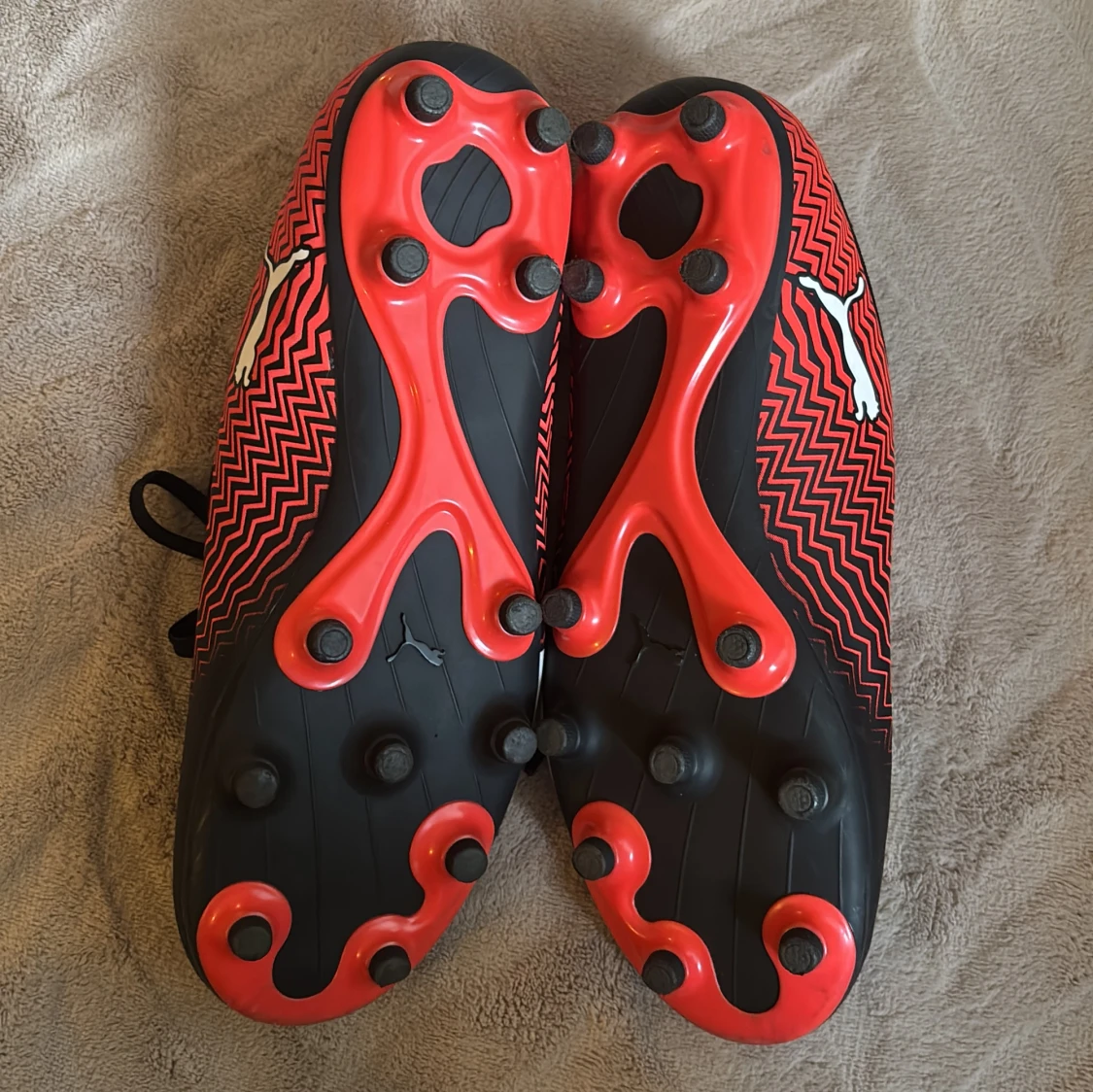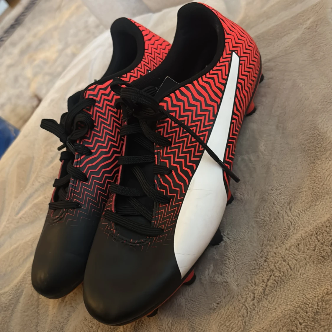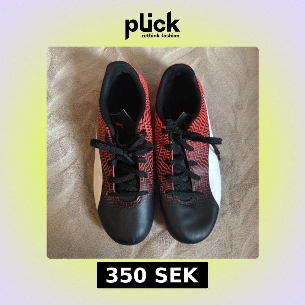 Säljer ett par snygga fotbollsskor från Puma i svart och rött med coolt zickzack-mönster och vita detaljer. Skorna har snörning och dobbar för bra grepp på planen. Perfekta för dig som vill sticka ut på matchen!