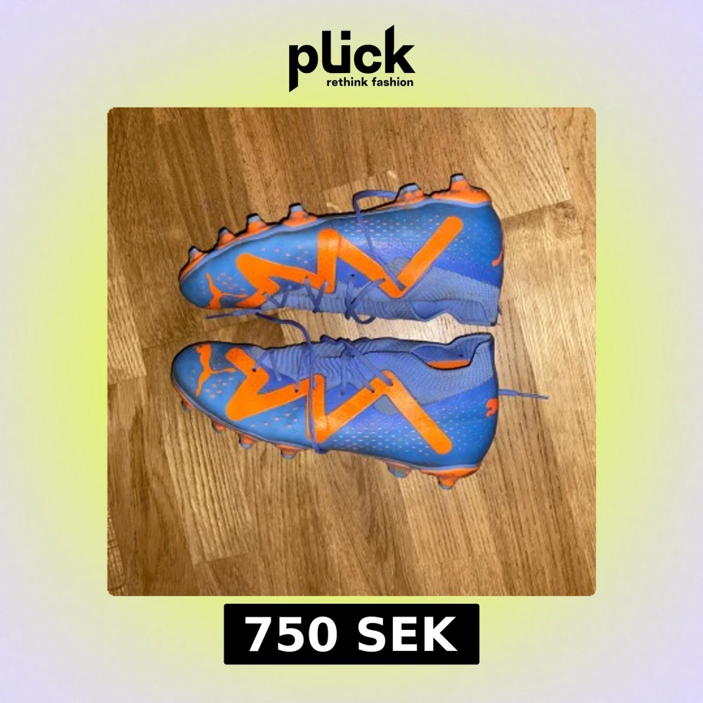 Säljer ett par blå fotbollsskor från Puma med orangea detaljer och snörning. Skorna har rund tå och platt sula med dobbar, perfekta för spel på gräsplan. Snygg design med tydlig Puma-logga på sidan. De är ganska stora i storleken så de passar bra även om man har lite större än 38,5