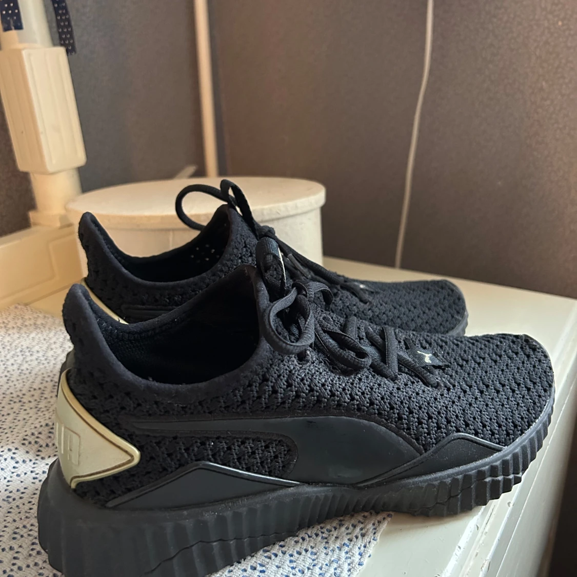 Snygga svarta sneakers från Puma med stickad ovandel och snörning. Skorna har en robust sula och guldiga detaljer på hälen. Perfekta för en sportig look.
