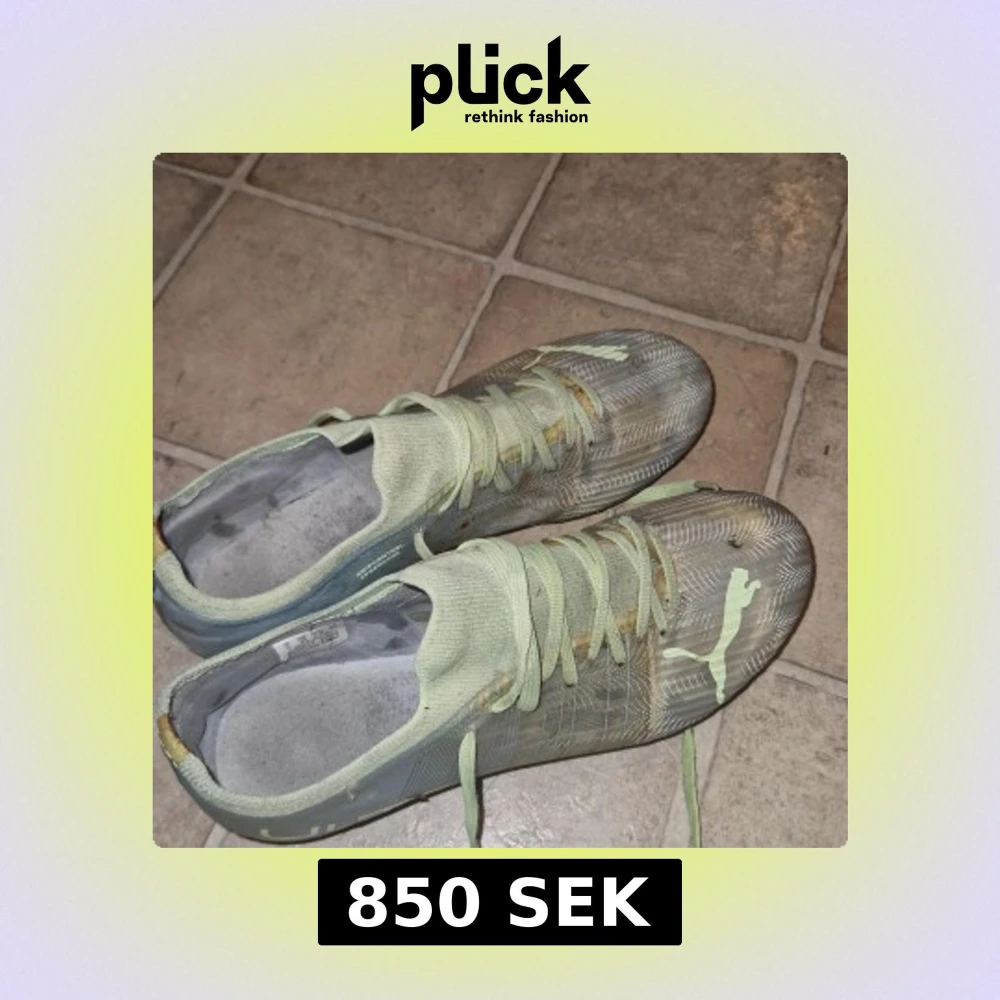 Säljer ett par lätta fotbollsskor från Puma i ljusgrönt med vita detaljer och snörning. Skorna har mönstrad ovandel och rund tå, samt fasta dobbar för bra grepp på planen. Perfekta för dig som vill sticka ut på matchen!