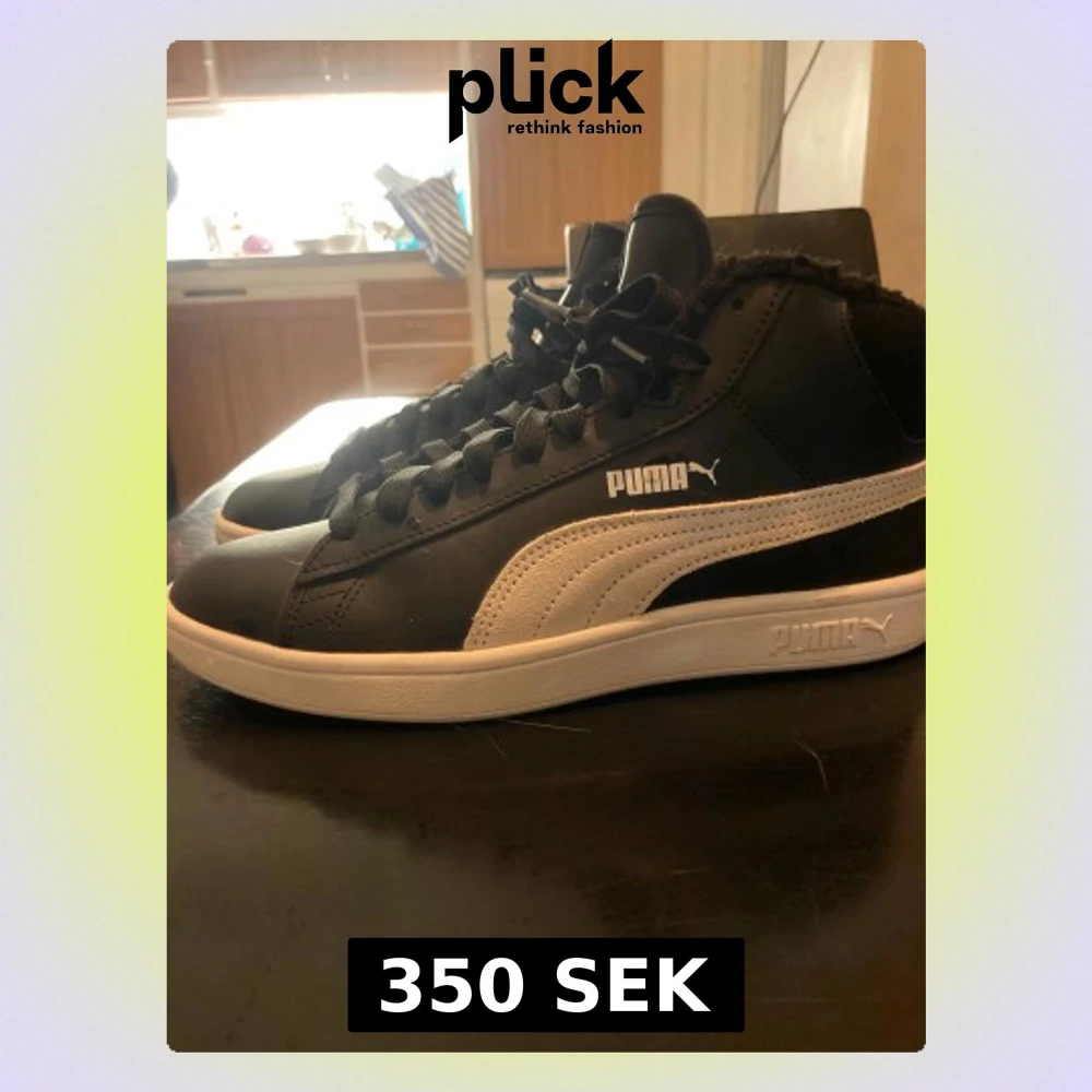 Säljer ett par svarta höga sneakers från Puma med vit sula och vit klassisk Puma-logga på sidan. Skorna har snörning, rund tå och är tillverkade i syntetmaterial med mjukt foder runt ankeln. Perfekta för dig som gillar streetstyle och vill ha en clean look. Den passar in med allt och håller värmen länge!