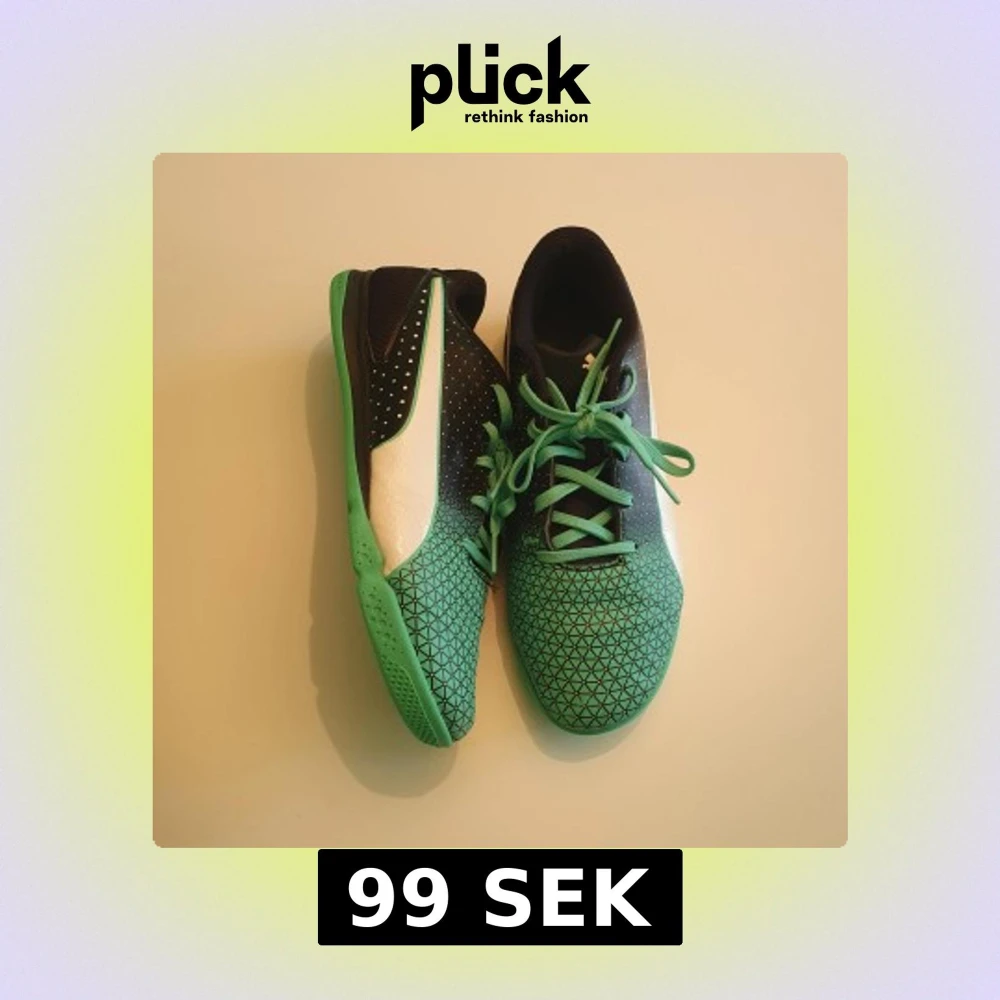 Snygga fotbollsskor från Puma i grönt och svart med coolt geometriskt mönster på ovandelen. Skorna har snörning, vit detalj på sidan och en platt grön sula med Puma-logga undertill. Perfekta för dig som vill sticka ut på planen.