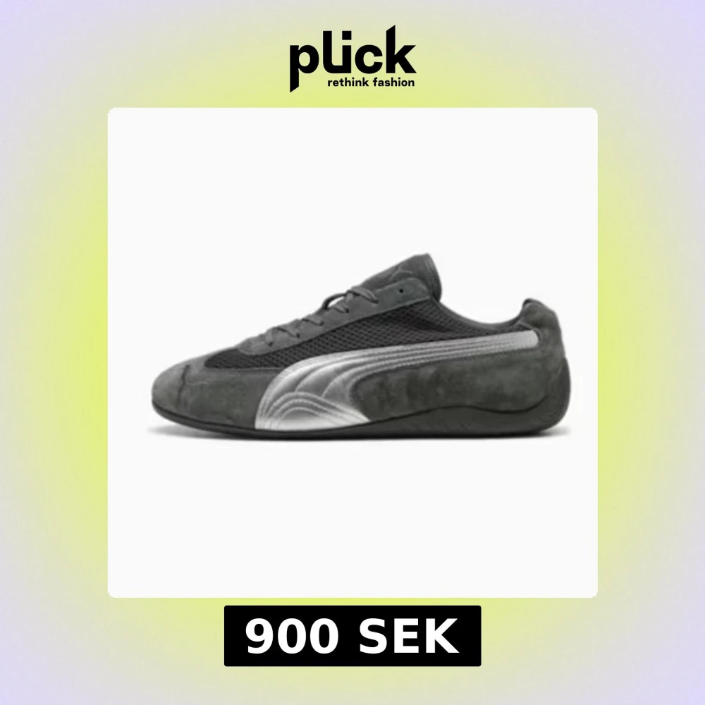 Säljer ett par stilrena Puma sneakers i mörkgrå mocka och mesh med silvriga detaljer på sidan. Skorna har snörning och låg profil, perfekt för dig som gillar en clean och sportig look. Ikonisk Puma-logga på tån och sidan.