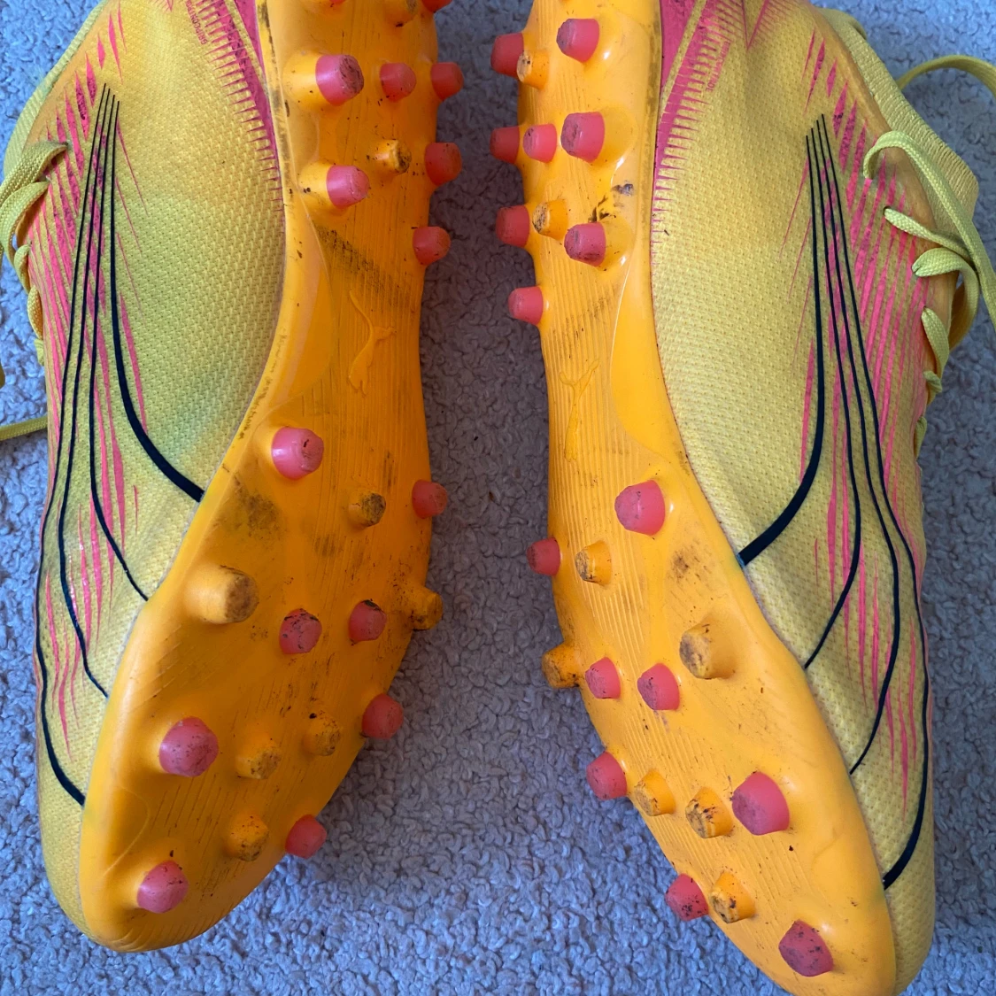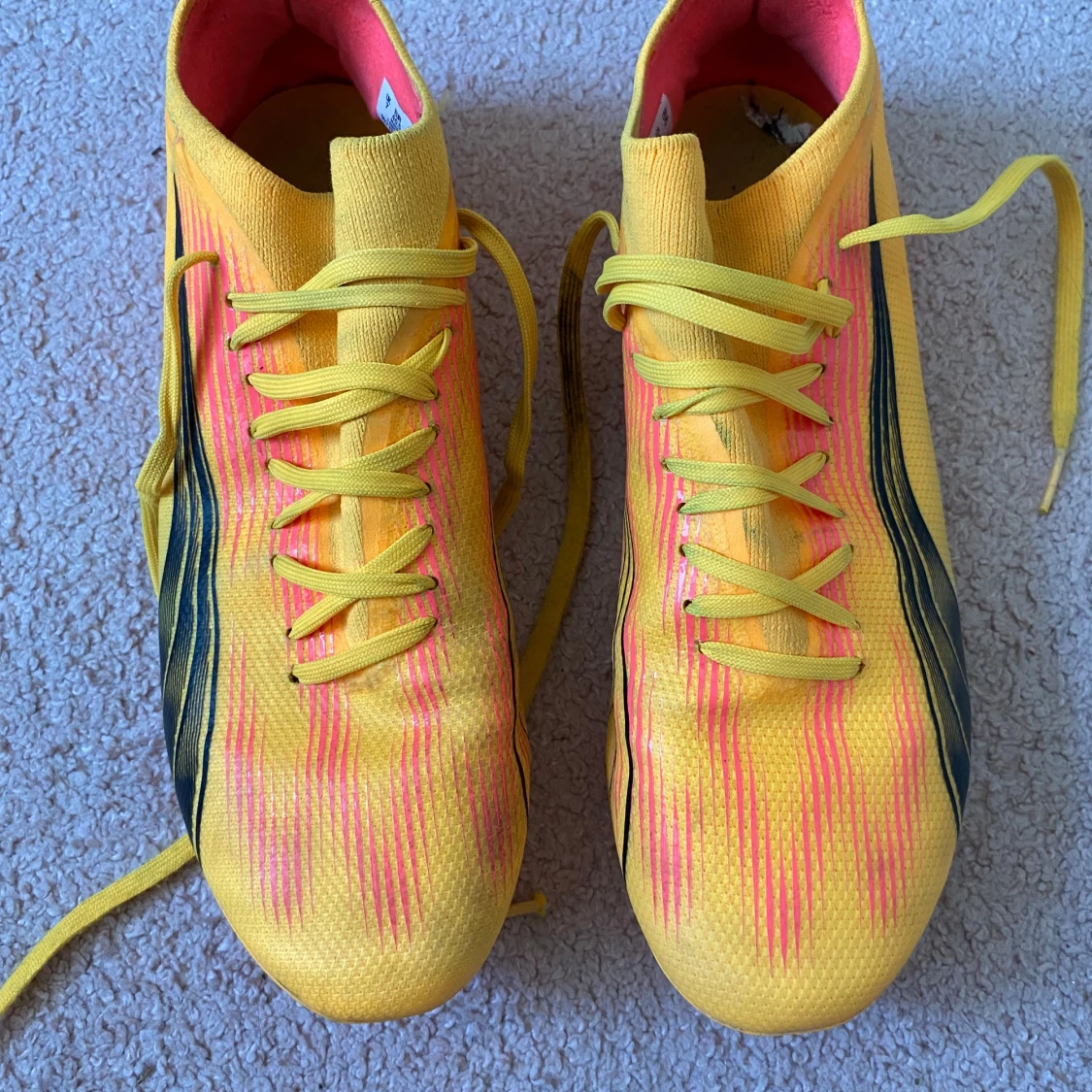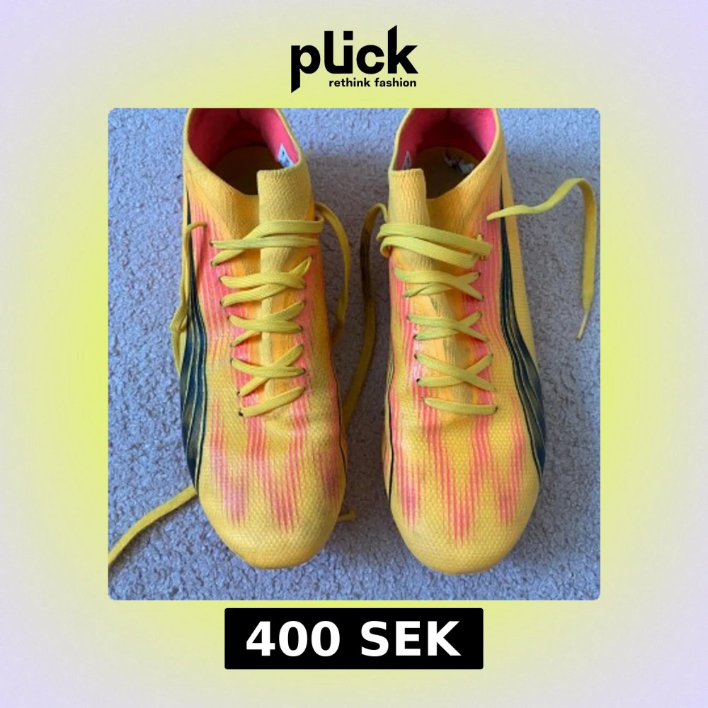 Säljer ett par gula fotbollsskor från Puma med svarta och rosa detaljer. Skorna har snörning och är tillverkade i syntetmaterial. Yttersulan har fasta dobbar för spel på gräs. Perfekta för dig som vill sticka ut på planen!