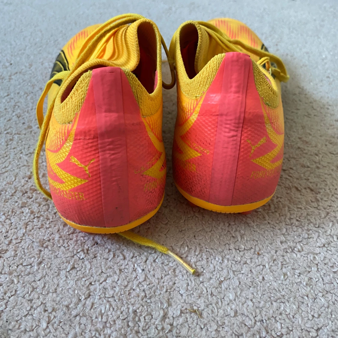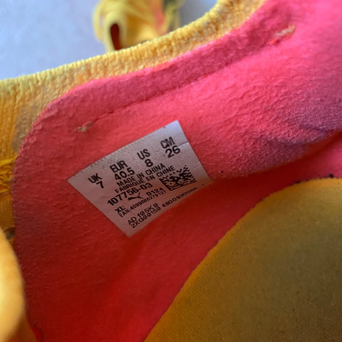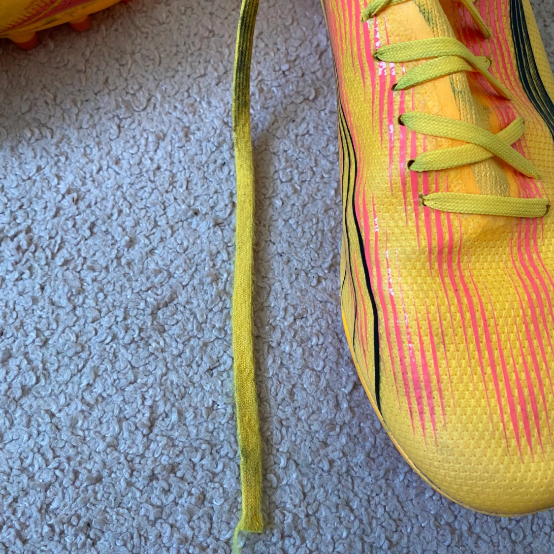Säljer ett par gula fotbollsskor från Puma med svarta och rosa detaljer. Skorna har snörning och är tillverkade i syntetmaterial. Yttersulan har fasta dobbar för spel på gräs. Perfekta för dig som vill sticka ut på planen!