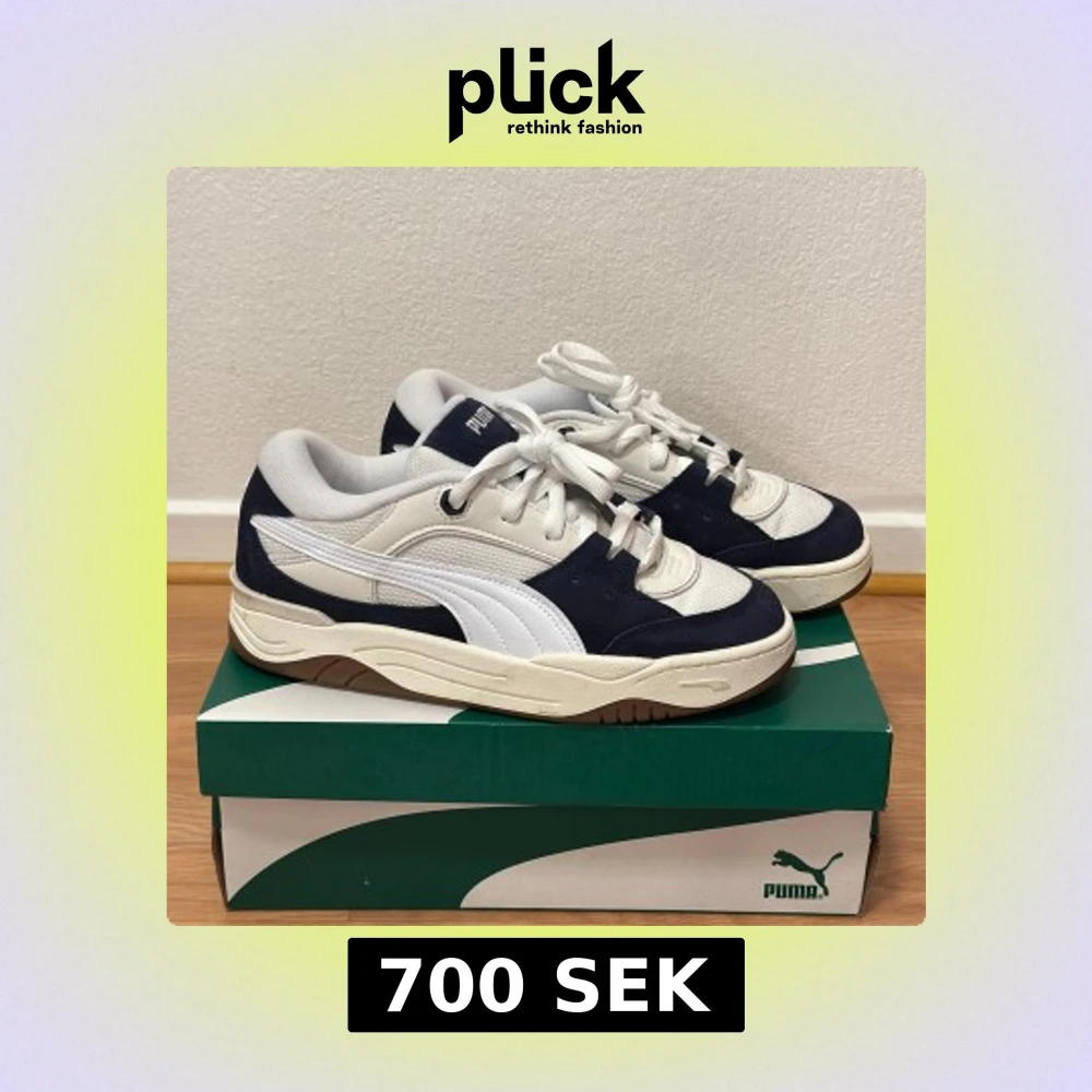 Snygga Puma sneakers i marinblå och vit med klassisk design. Skorna har snörning och en bekväm passform, perfekt för vardagsbruk. De kommer i originalkartong.