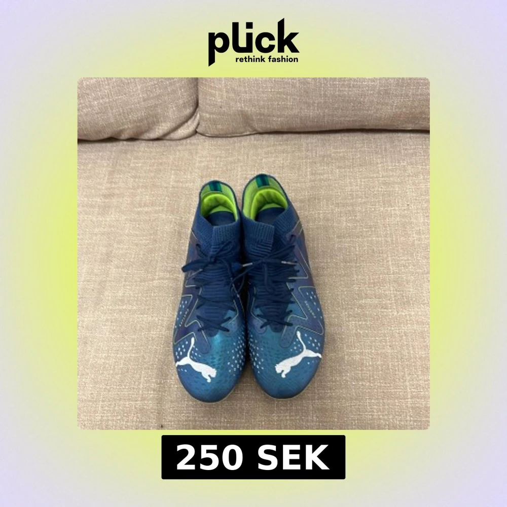 Säljer ett par blåa fotbollsskor från Puma med vita detaljer och gröna insidor. Skorna har snörning, rund tå och platt sula med dobbar för bra grepp på planen. Perfekta för dig som vill sticka ut på matchen!