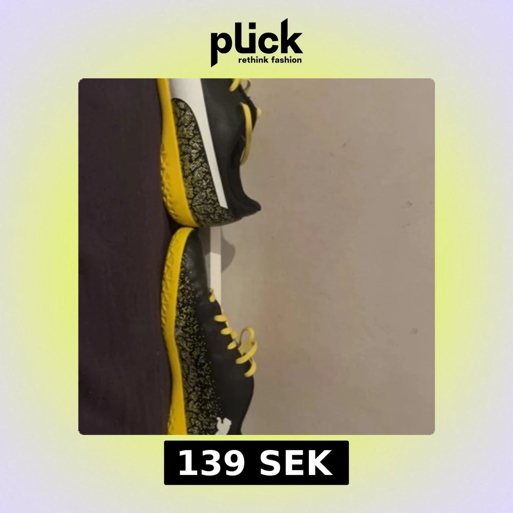 Säljer ett par snygga Puma fotbollsskor i svart och gult med gula snören och coolt mönster på sidorna. Skorna har en platt sula och är perfekta för dig som vill sticka ut på planen. Puma-logga på tungan och sidan. Storlek 41 (EU).