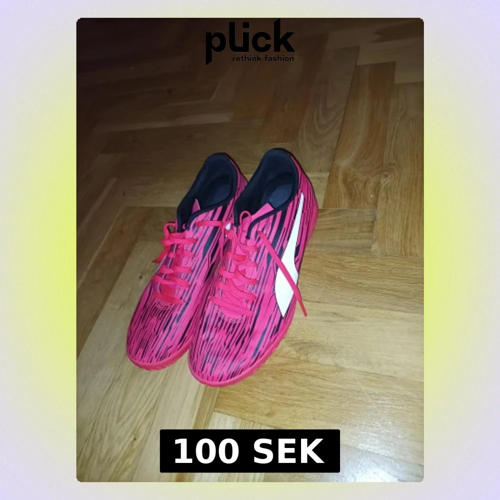 Säljer ett par snygga fotbollsskor från Puma i storlek 41. Skorna är rosa med svarta ränder och har vita Puma-loggor på sidorna. De har snörning och platt sula, perfekt för spel på konstgräs eller inomhus. Skorna har en sportig look och sticker verkligen ut på planen.