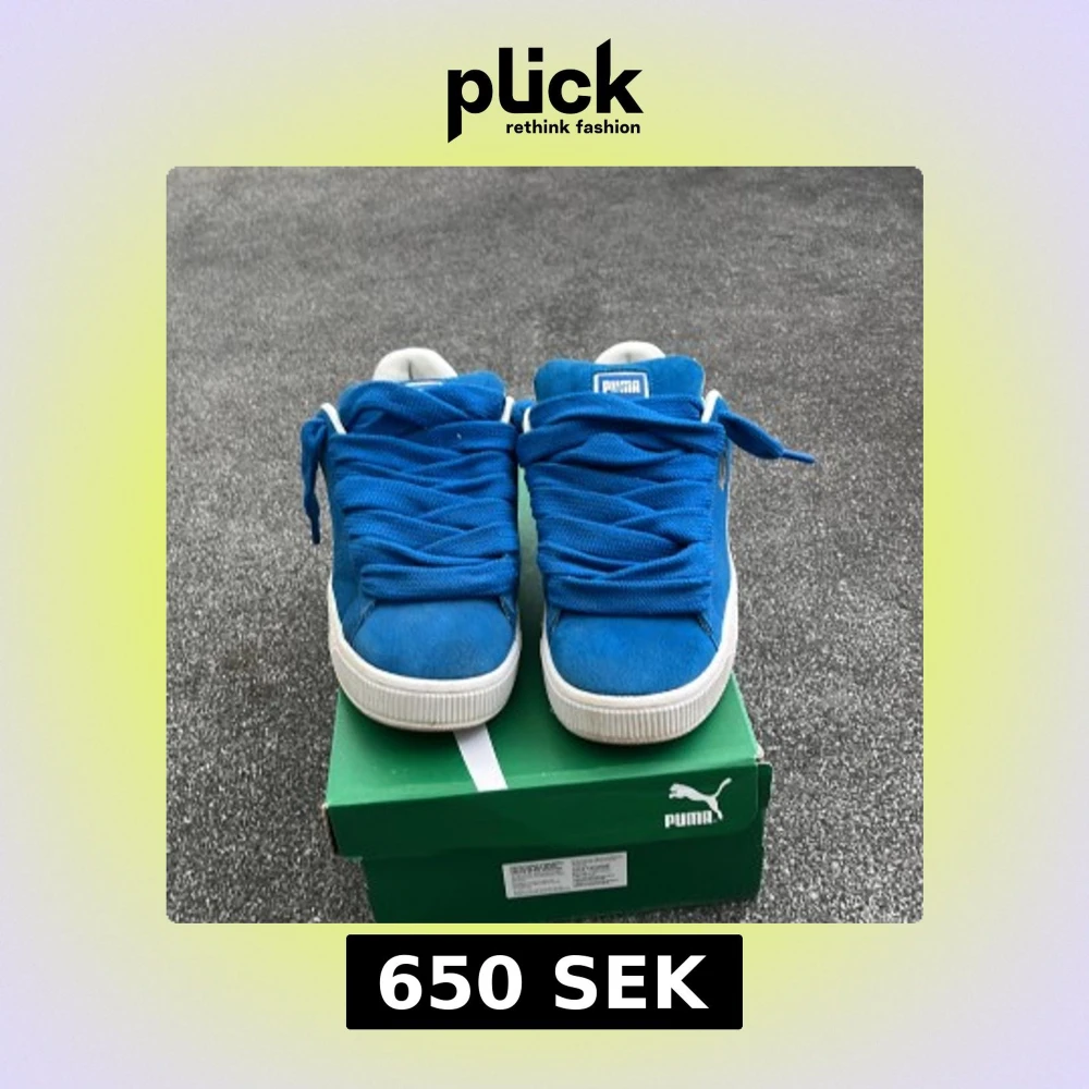 Snygga blå Puma Suede sneakers med breda blå skosnören och vit sula. Skorna har klassisk låg profil, vit sidodetalj och guldfärgad Puma-logga på sidan. Ovandelen är i mocka och insidan är vit med blå detaljer. Perfekta för dig som gillar retrostil. Låda och ett till vitt skosnöre igår också.
