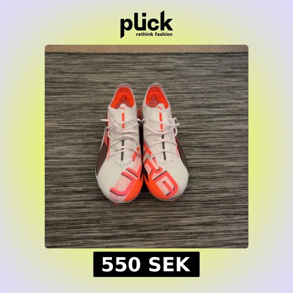 Säljer ett par Puma Ultra fotbollsskor i vitt och neonorange med svarta detaljer. Skorna har snörning, låg profil och mönstrad ovandel i syntetmaterial. Yttersulan har fasta dobbar för bra grepp på planen. Snygg och sportig design med ULTRA-tryck på hälen. De är använda 2 gånger tidigare.
