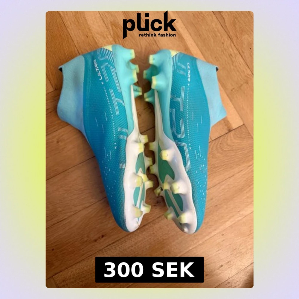 Säljer ett par grymma Puma Ultra fotbollsskor i turkos med vita och svarta detaljer. Skorna har strumpliknande skaft, plösfri design och mönstrad ovandel i syntetmaterial. Sulan är vit med gula dobbar för bästa grepp på planen. Perfekta för dig som vill sticka ut på matchen! Använda 3 mån