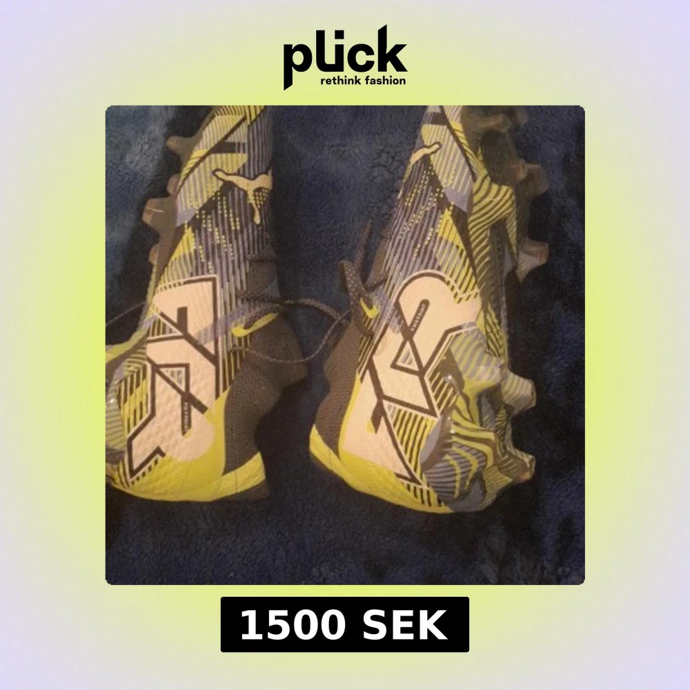 Snygga fotbollsskor med ett iögonfallande mönster i gult, blått och svart. Skorna har snörning och en robust sula med dobbar för bra grepp på planen.