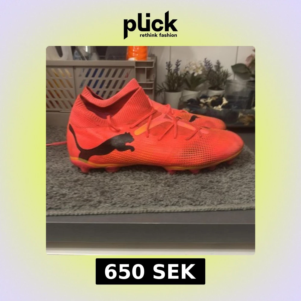Säljer ett par snygga röda fotbollsskor från Puma i storlek 42. Skorna har svart Puma-logga på sidan, snörning och en ovandel i syntetmaterial. Yttersulan är röd och gul med fasta dobbar, perfekt för gräsplan. Lätta och smidiga för snabba rörelser på planen.