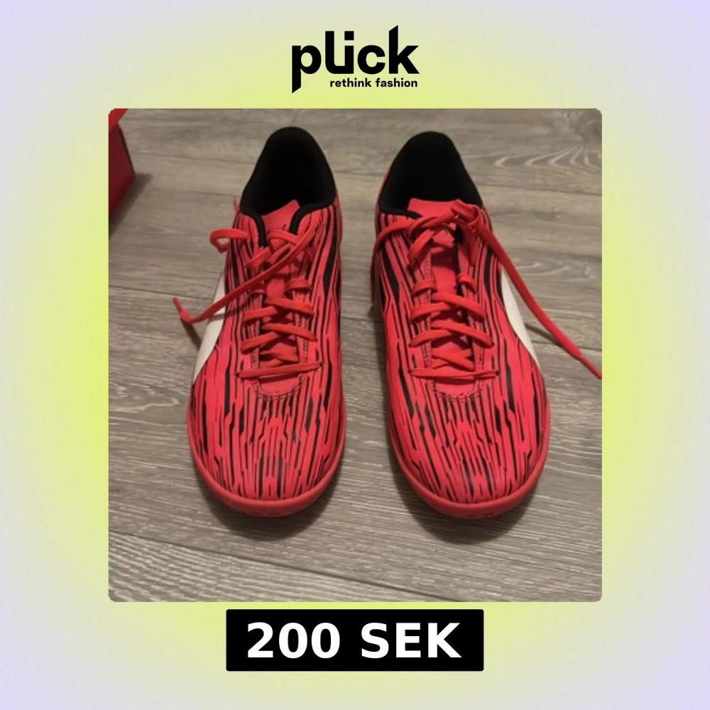 Säljer ett par röda fotbollsskor från Puma med svart grafiskt mönster och vit logga på sidan. Skorna har snörning och rund tå, samt svart insida. Perfekta för dig som vill sticka ut på planen!
